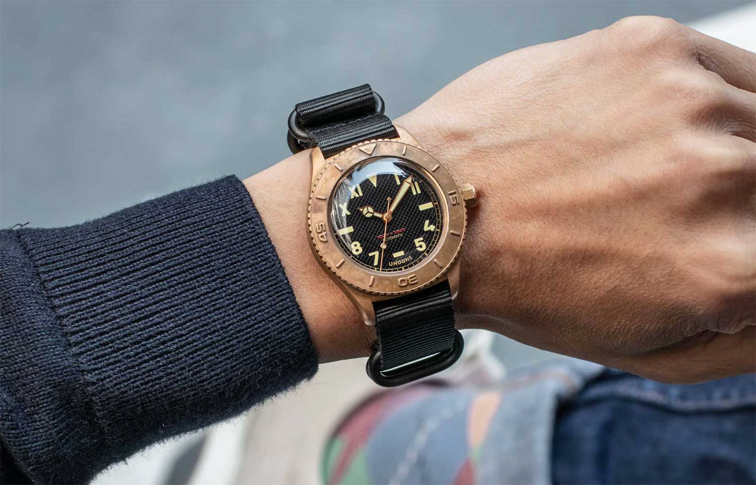 Basecamp Cali Bronze. Мужские часы с круглым бронзовым корпусом. В механизме 24 камня, частота 21600 полуколебаний в час. Запас хода 41 час. Возможность ручного завода. Циферблат защищен поликарбонатным стеклом Lexan. Метки в виде штрихов, римских и арабских цифр. Стрелки и метки с люминесцентным покрытием, которое светится в темноте после непродолжительной зарядки на свету. Прозрачная задняя крышка. Ремешок с классической застежкой.