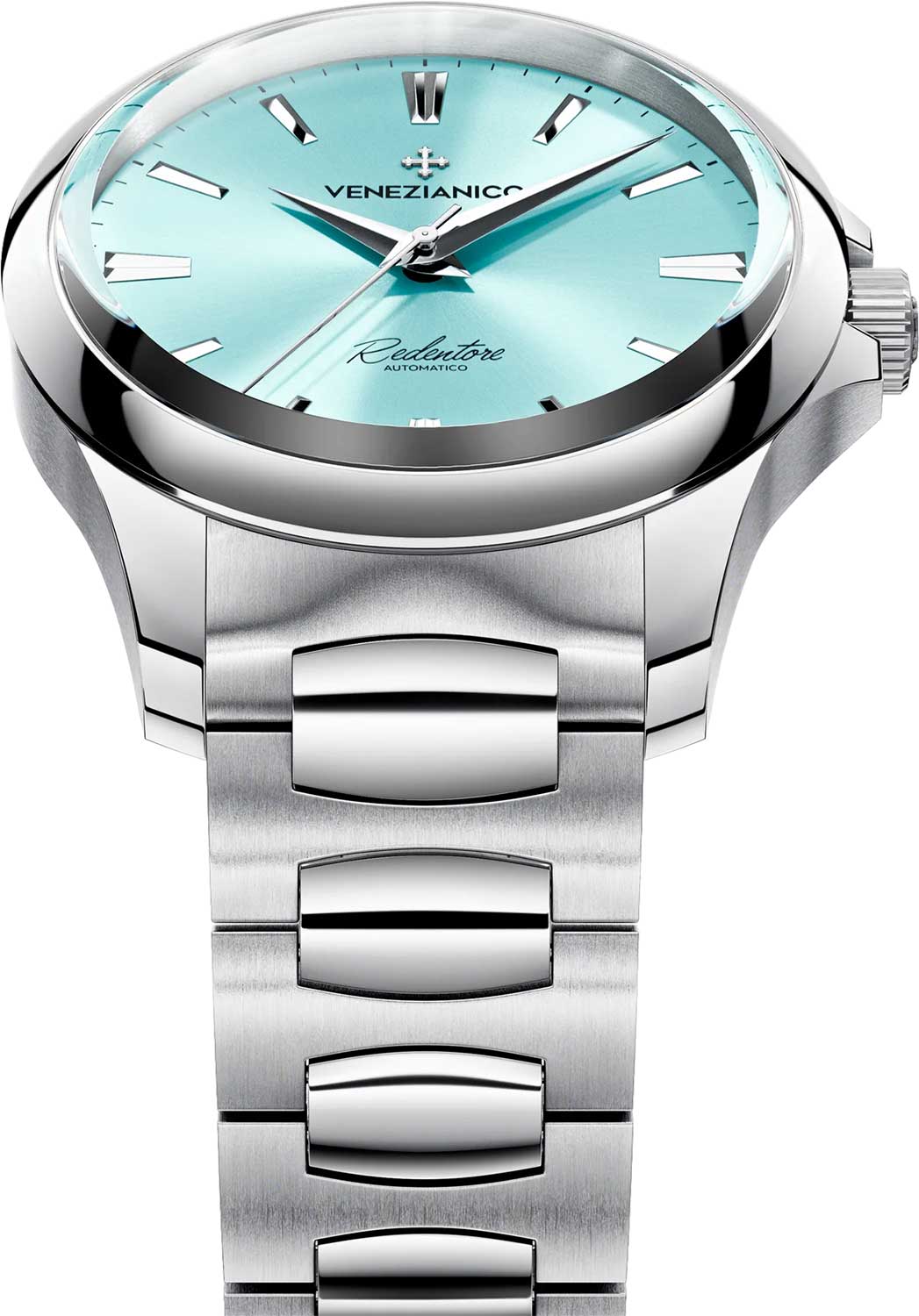 Cтильные женские часы, которые сочетают в себе классический дизайн, высокое качество и функциональность. Redentore 36. Часы с круглым корпусом. Дизайн вдохновлен храмом Basilica del Santissimo Redentore, который находится на самом широком острове Венеции. Архитектор храма Андреа Палладио, который известен как отец неоклассического стиля. В механизме 24 камня, 21600 полуколебаний в час. Запас хода 41 час. Возможность ручного завода. Циферблат с метками в виде штрихов выполнен по технологии Sunray (солнечные лучи). Окошко даты находится в положении 3 часа. Задняя крышка крепится на 6-ти винтах и украшена выгравированным изображением храма Basilica del Santissimo Redentore. Рифленая заводная головка с защитой. Браслет Canova с раскладывающейся застежкой. Для изготовления данного браслета требуется 16 различных форм.
