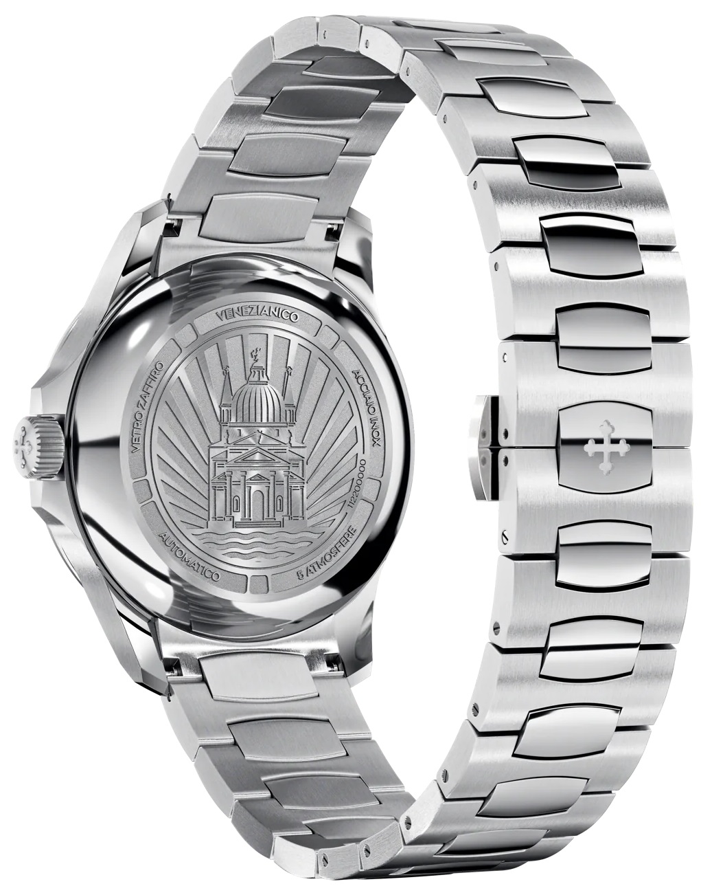 Привлекательные женские часы станут отличным дополнением любого вашего образа. Redentore 36. Часы с круглым корпусом. Дизайн вдохновлен храмом Basilica del Redentore, который находится на самом широком острове Венеции. Архитектор храма Андреа Палладио, который известен как отец неоклассического стиля. В механизме 24 камня, 21600 полуколебаний в час. Запас хода 41 час. Возможность ручного завода. Циферблат с метками в виде штрихов выполнен по технологии Sunray (солнечные лучи). Задняя крышка крепится на 6-ти винтах и украшена выгравированным изображением храма Basilica del Redentore. Рифленая заводная головка с защитой. Браслет Canova с раскладывающейся застежкой. Для изготовления данного браслета требуется 16 различных форм.