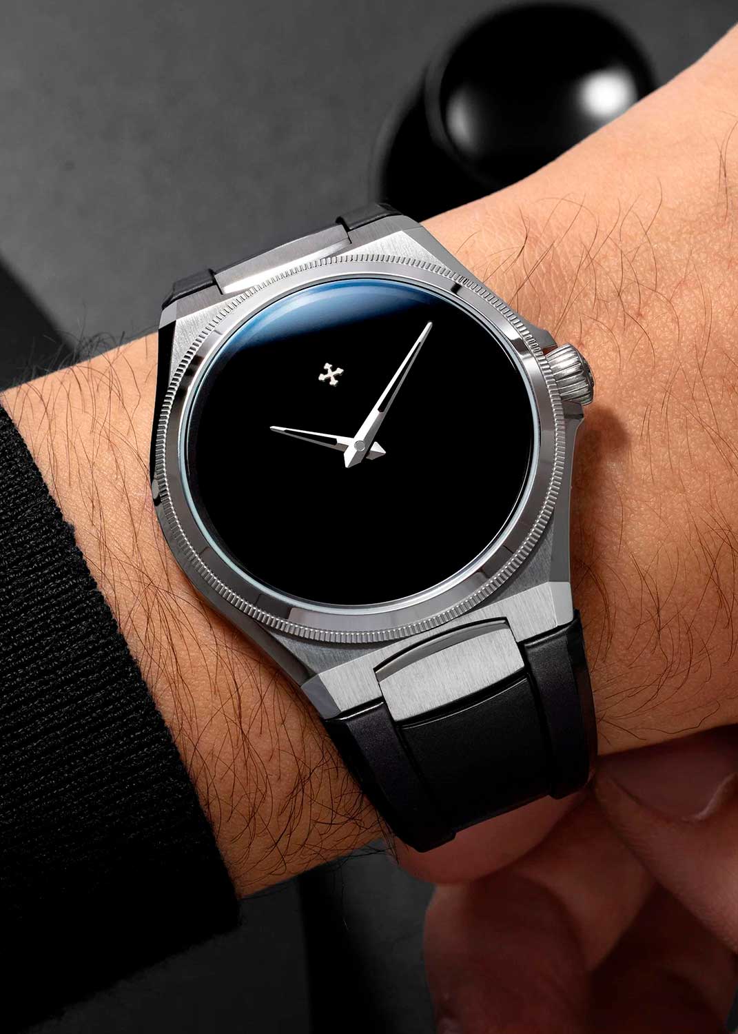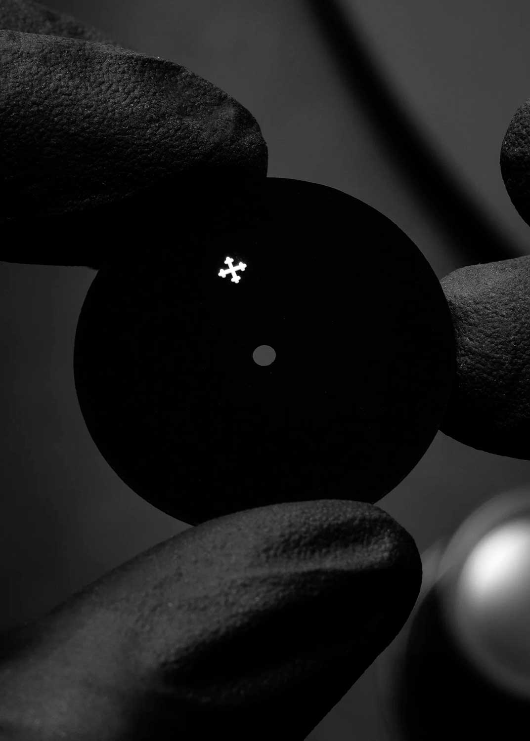 Связь между прошлым и будущим выражена в абсолютно черном цвете циферблата, который символизирует бесконечность и притягательность неизведанного. Черный матовый циферблат с адаптированным покрытием Musou Black™, которое поглощает 99,4% света.