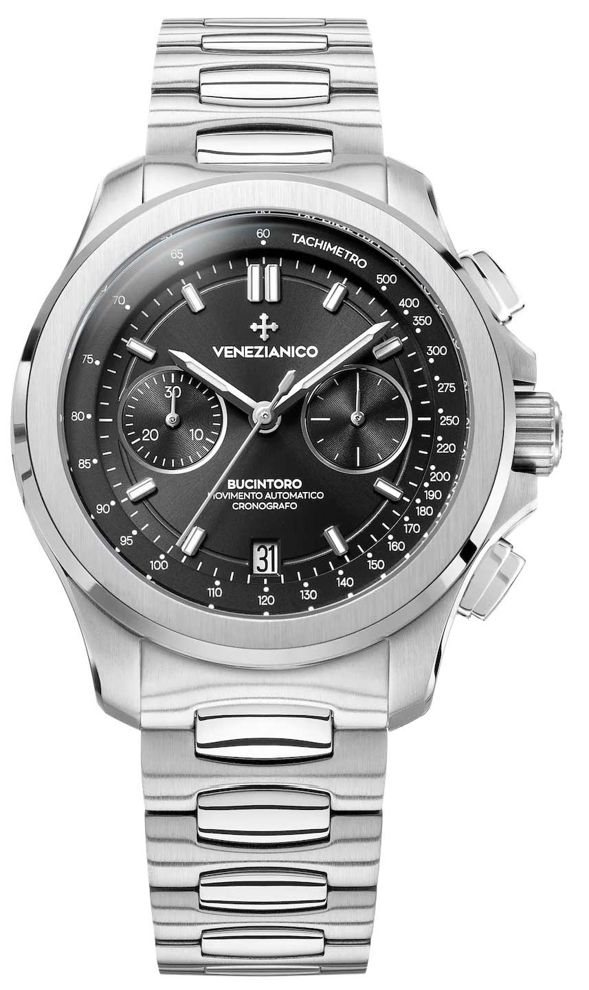 Bucintoro. Мужские часы-хронограф с круглым корпусом. Коллекция Bucintoro названа в честь венецианского судна, которое открывает ежегодные соревнования по гребле, известные как «Историческая регата» (Regata Storica). Часы оснащены высокоточным японским механизмом Seiko NE86, частота полуколебаний которого достигает 28 800 в час. Окошко даты в положении 6 часа. Часы имеют секундомер и тахиметр, счетчик на 30 минут, а также функцию мгновенного сброса стрелок хронографа. Задняя крышка крепится на 6-ти винтах и украшена выгравированным изображением гребного судна. Индивидуальный серийный номер. Рифленая заводная головка с защитой. Браслет Canova с раскладывающейся застежкой. Для изготовления данного браслета требуется 16 различных форм. Эта гонка идеально сочетает в себе концепцию скорости на воде и традицию.