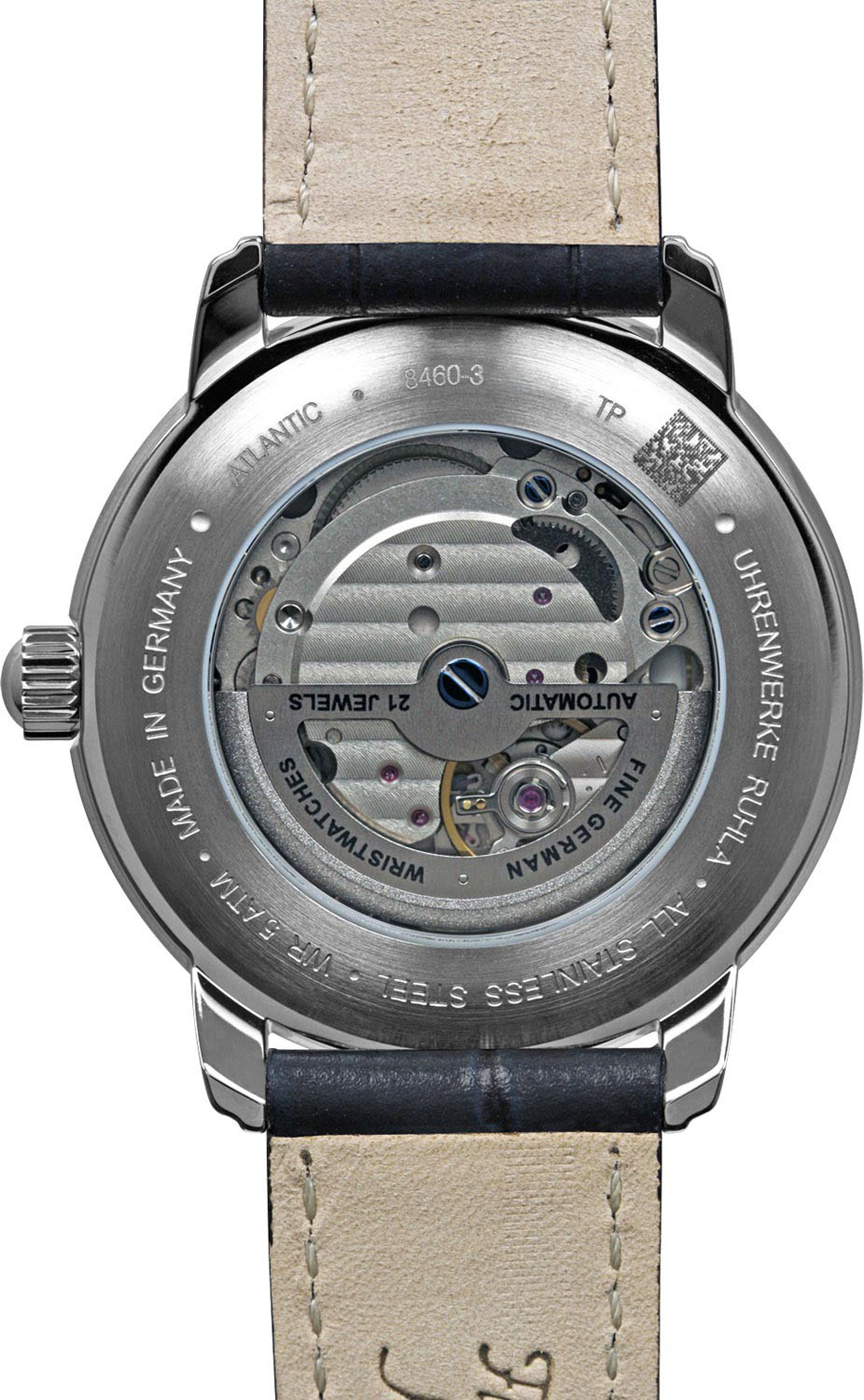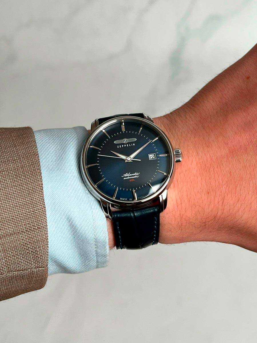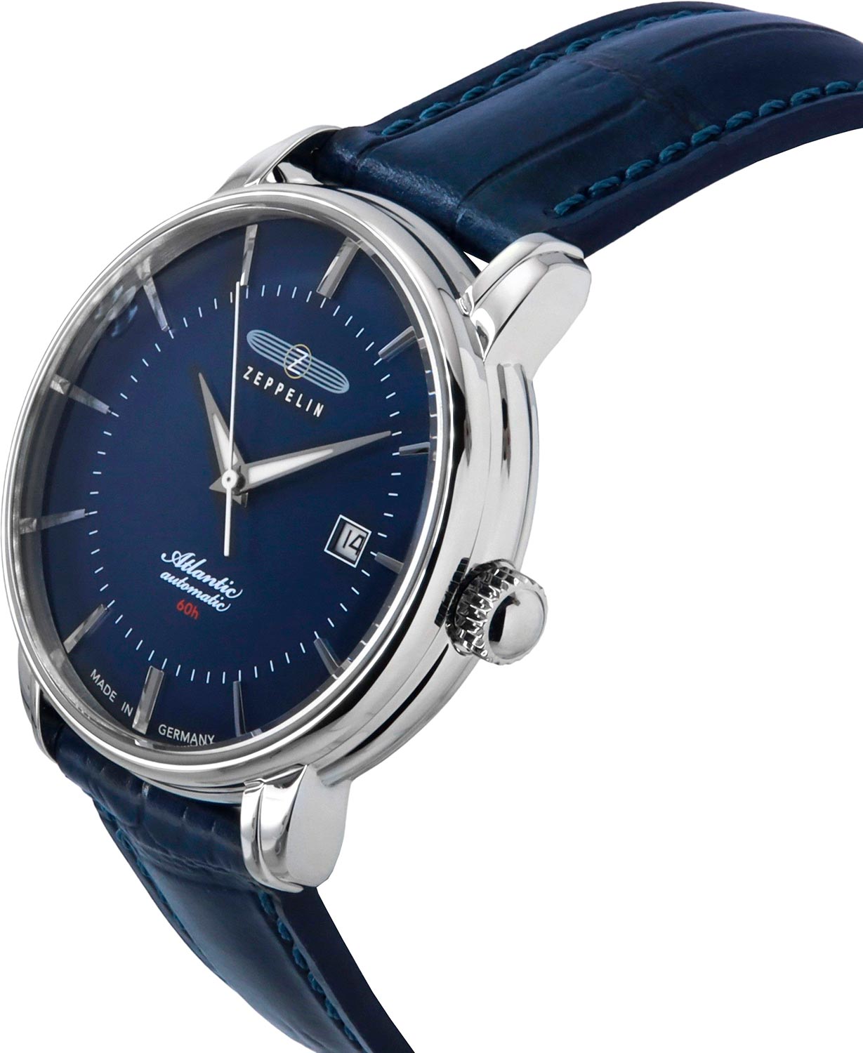 Мужские наручные автоматические часы Atlantic Automatic. Круглый корпус из полированной нержавеющей стали, изготовленный вручную с типичными кольцами Zeppelin по краю. В механизме 21 камень, частота 21600 полуколебаний в час. Запас хода 60 часов. Матовый циферблат. Серебристые накладные метки в виде штрихов. Окошко даты в положении 3 часа.