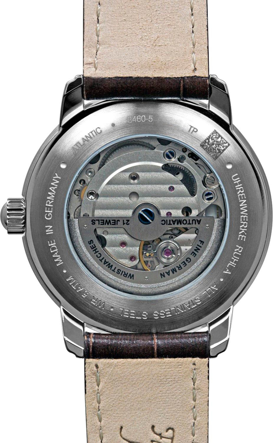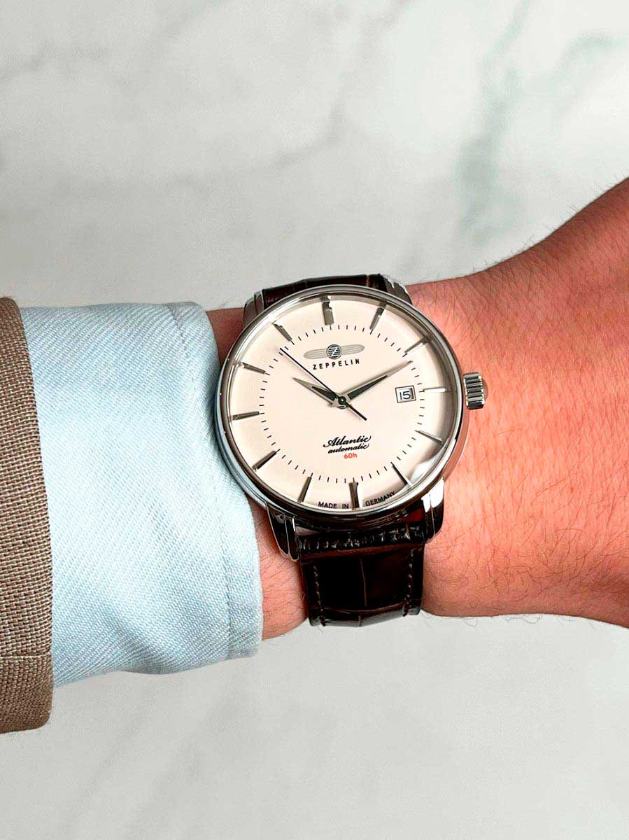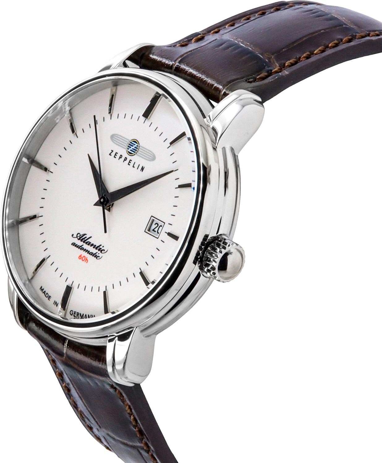 Мужские наручные автоматические часы Atlantic Automatic. Круглый корпус из полированной нержавеющей стали, изготовленный вручную с типичными кольцами Zeppelin по краю. В механизме 21 камень, частота 21600 полуколебаний в час. Запас хода 60 часов. Матовый люминесцентный циферблат. Серебристые накладные метки в виде штрихов. Окошко даты в положении 3 часа.