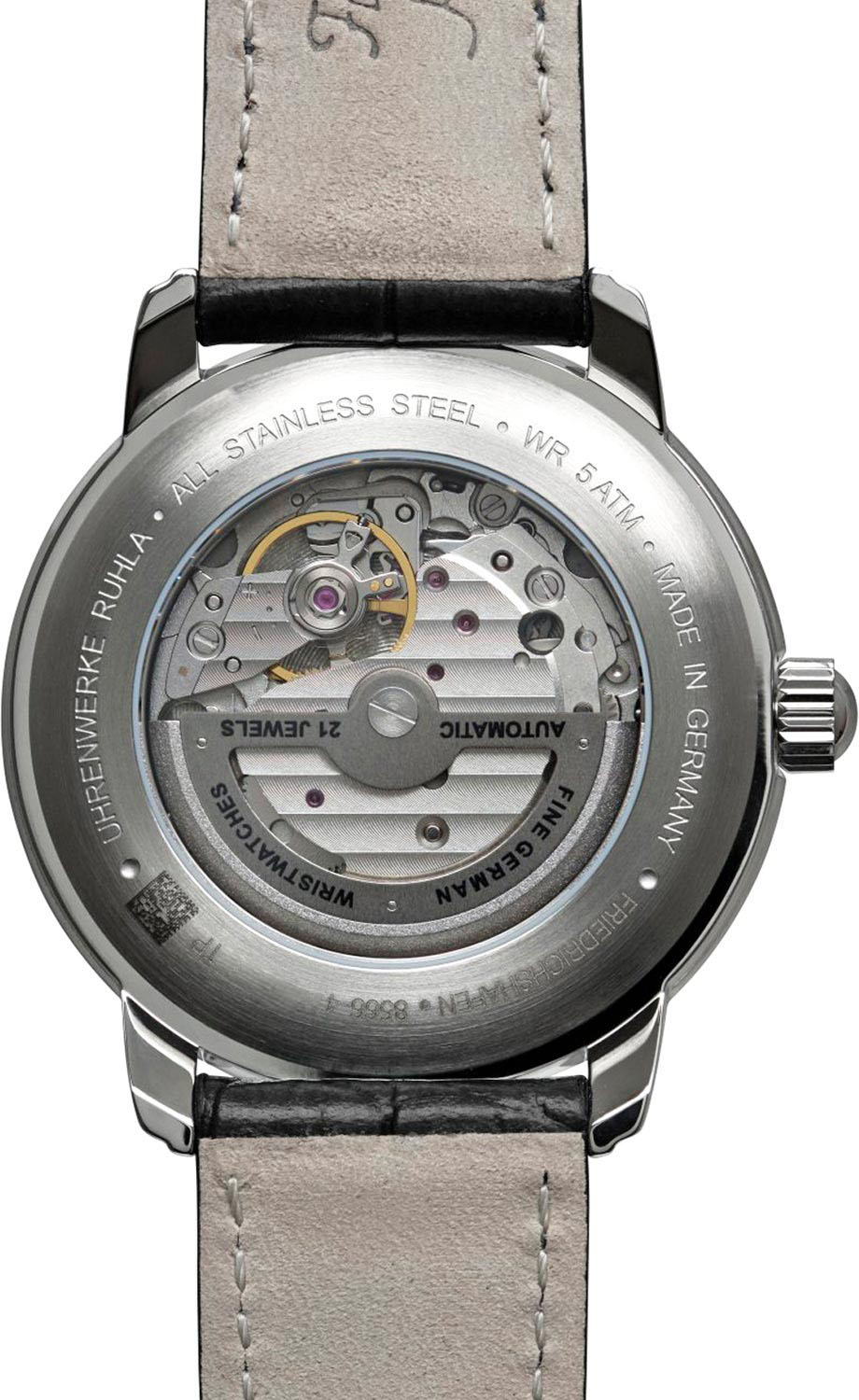 Сквозь прозрачное окошко на циферблате можно наблюдать за работой механизма часов. Секундная стрелка вынесена на отдельный циферблат. Выпуклое минеральное стекло. Прозрачная задняя крышка. Рифленая заводная головка из нержавеющей стали. Ремешок из черной натуральной кожи с имитацией крокодиловой кожи. Классическая застежка из нержавеющей стали.
