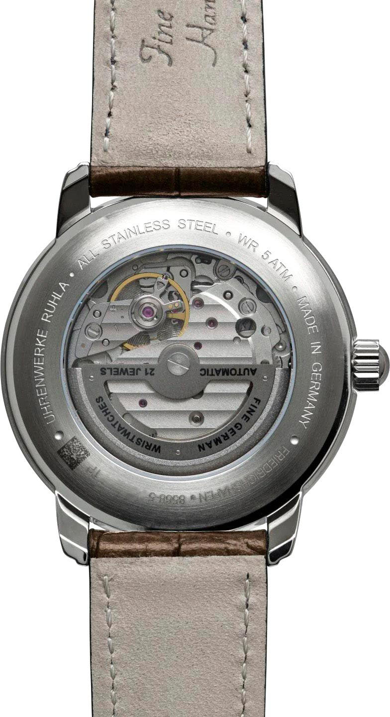 Мужские наручные автоматические часы Friedrichshafen Automatic. Круглый корпус из полированной нержавеющей стали, изготовленный вручную с типичными кольцами Zeppelin по краю. В механизме 21 камень, частота 21600 полуколебаний в час. Запас хода 42 часа. Циферблат выполнен по технологии гильоше с узором Clous de Paris. Метки в виде арабских цифр.