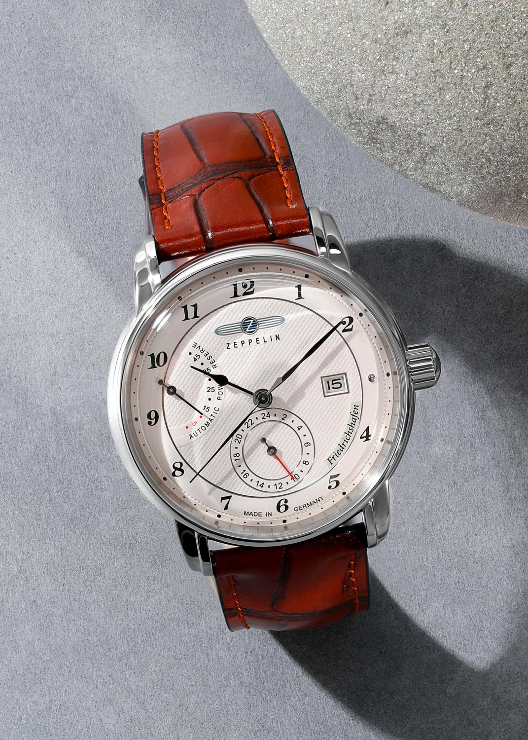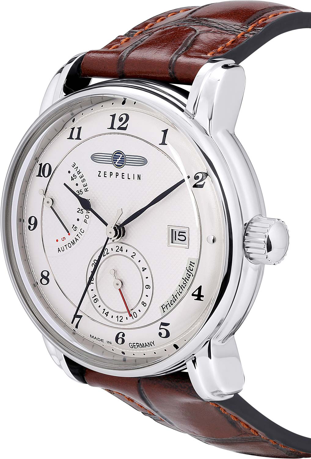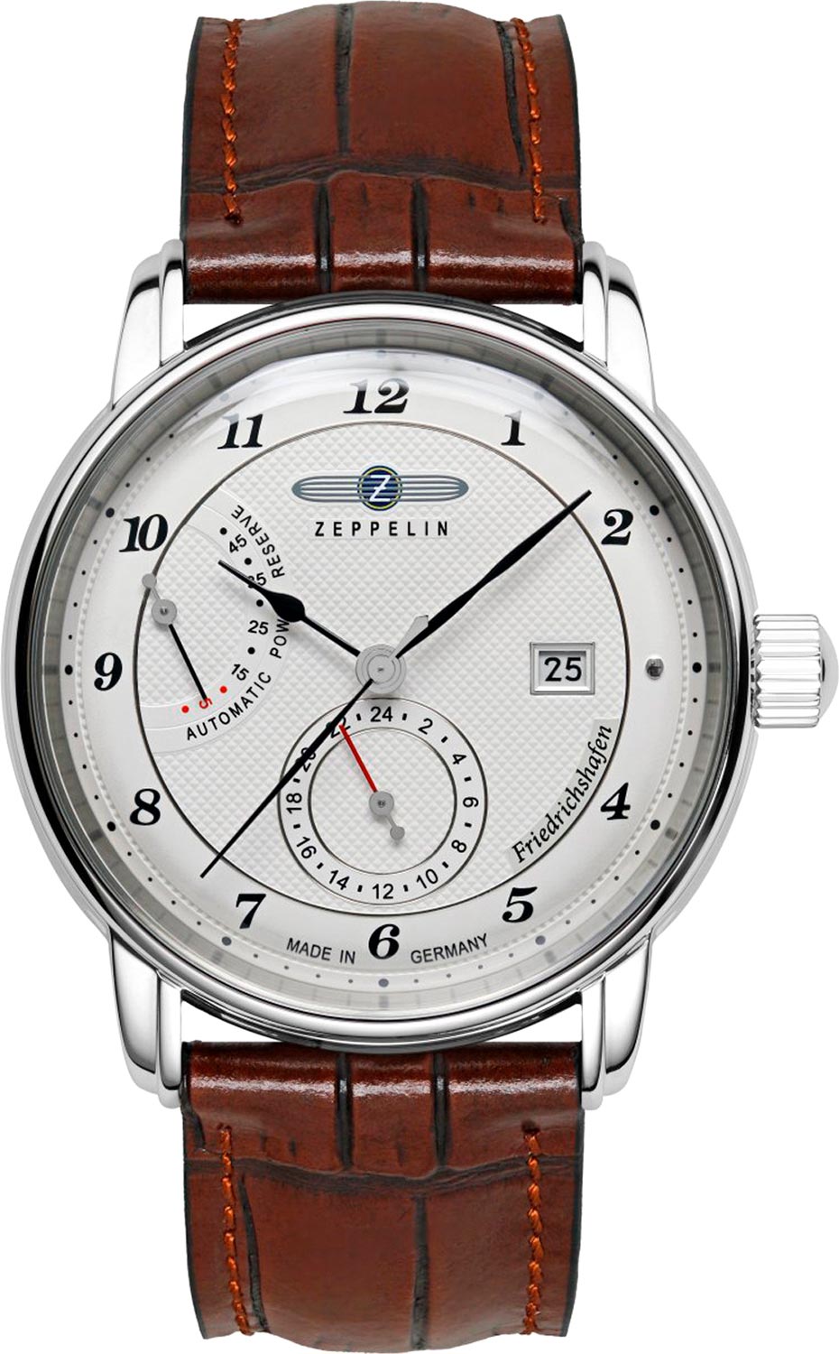 Мужские наручные автоматические часы Friedrichshafen Automatic Power Reserve. Круглый корпус из полированной нержавеющей стали, изготовленный вручную с типичными кольцами Zeppelin по краю. В механизме 26 камней,частота 28800 полуколебаний в час. Ретроградный указатель запаса хода на 45 часов. Циферблат выполнен по технологии гильоше с узором Clous de Paris. Метки в виде арабских цифр.