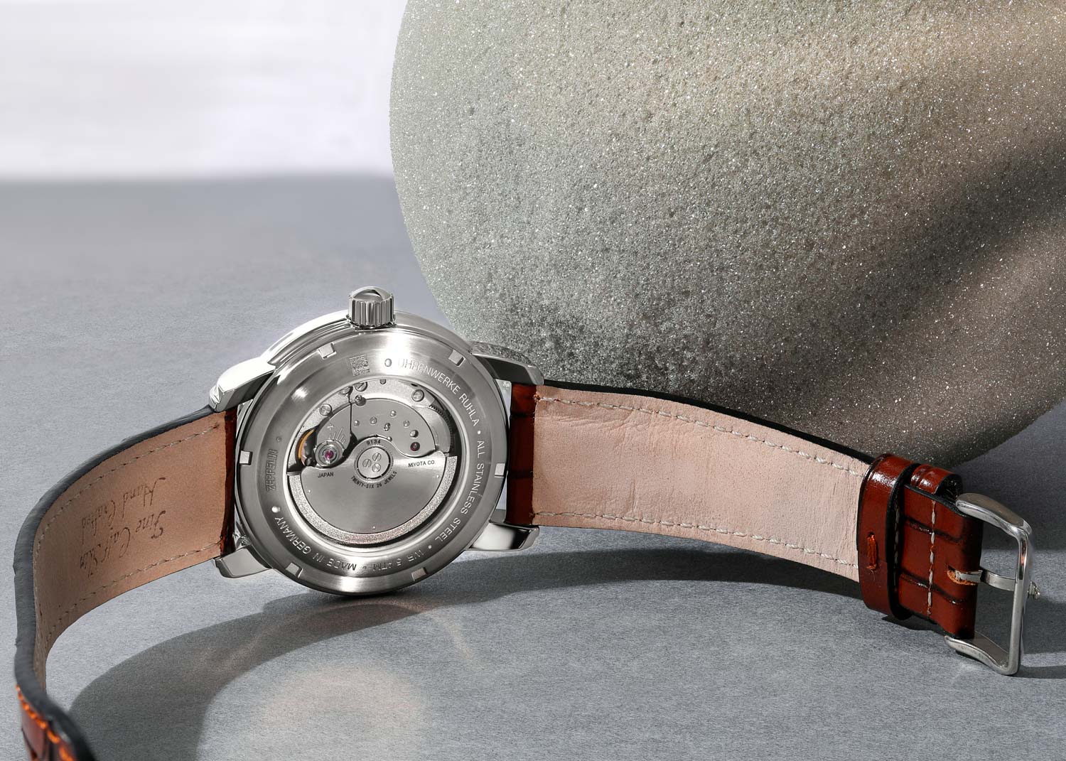 стекло. Прозрачная задняя крышка. Рифленая заводная головка из нержавеющей стали. Ремешок из коричневой натуральной кожи с имитацией крокодиловой кожи. Классическая застежка из нержавеющей стали.
