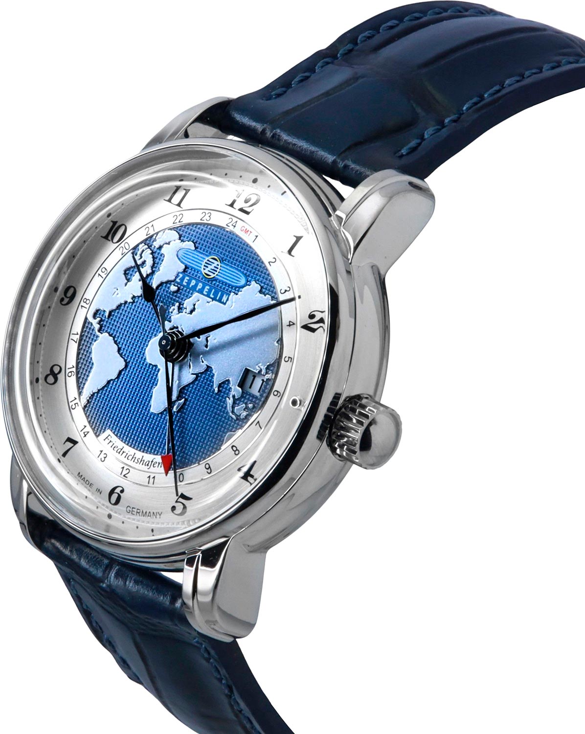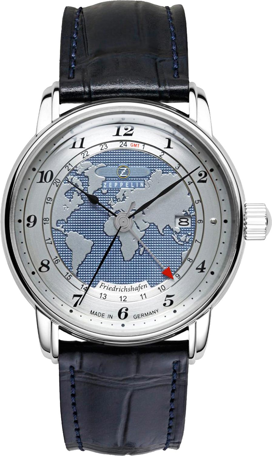 Мужские наручные автоматические часы Friedrichshafen Automatic GMT. Круглый корпус из полированной нержавеющей стали, изготовленный вручную с типичными кольцами Zeppelin по краю. В механизме 24 камня,частота 28800 полуколебаний в час. Запас хода 42 часа. Центральная часть циферблата украшена гравировкой карты мира, дополненной гильоше с узором Clous de Paris. Метки в виде арабских цифр.