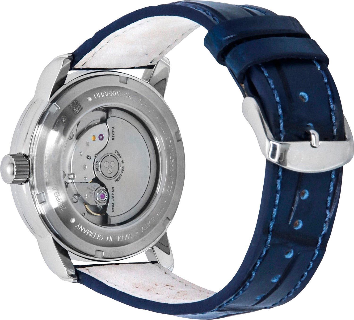 стекло. Прозрачная задняя крышка. Рифленая заводная головка из нержавеющей стали. Ремешок из синей натуральной кожи с имитацией крокодиловой кожи. Классическая застежка из нержавеющей стали.