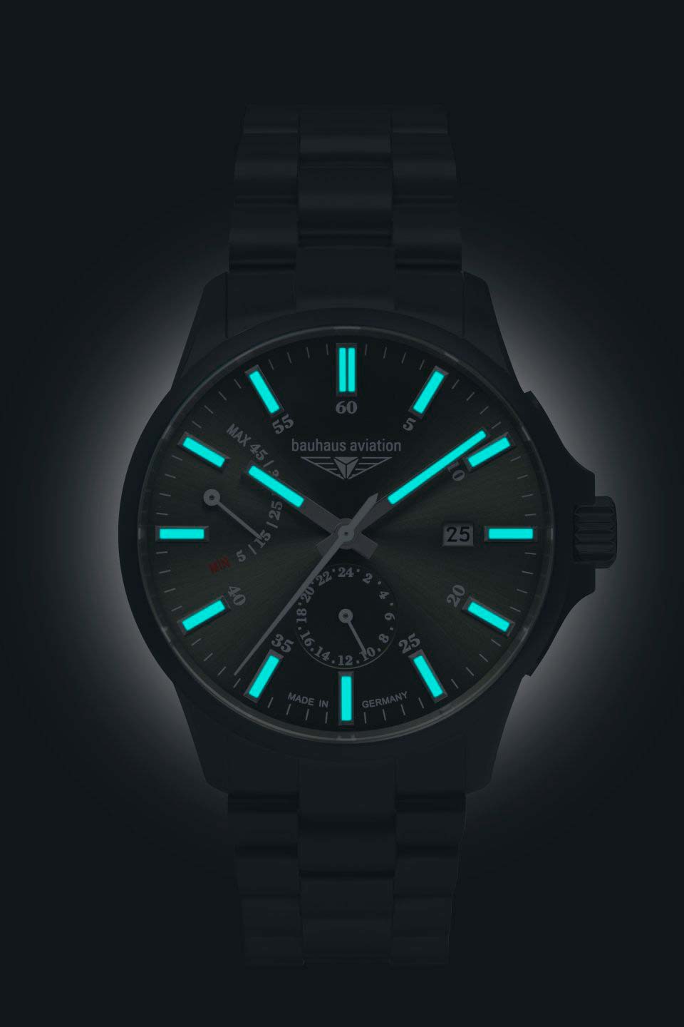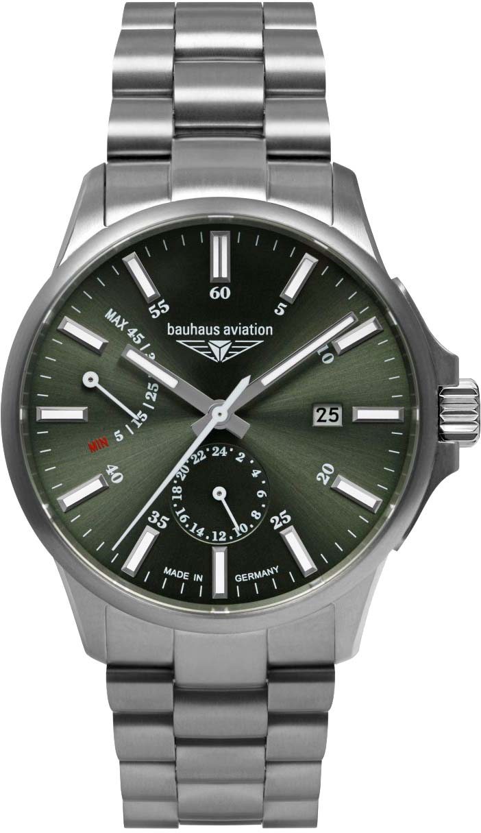 Этот аксессуар станет незаменимым помощником не только для пилотов, но и для любителей активного образа жизни. Водонепроницаемые мужские наручные часы. В механизме 26 камней. Круглый титановый корпус. Циферблат выполнен по технологии Sunray (солнечные лучи). Прямоугольные стрелки в стиле Baton. Метки в виде штрихов. 12-ти и 24-х часовой формат времени отображается на отдельном циферблате. Окошко даты находится в положении 3 часа. Ретроградный указатель запаса хода. Рифленая заводная головка с защитой. Завинчивающаяся прозрачная задняя крышка. Титановый браслет.