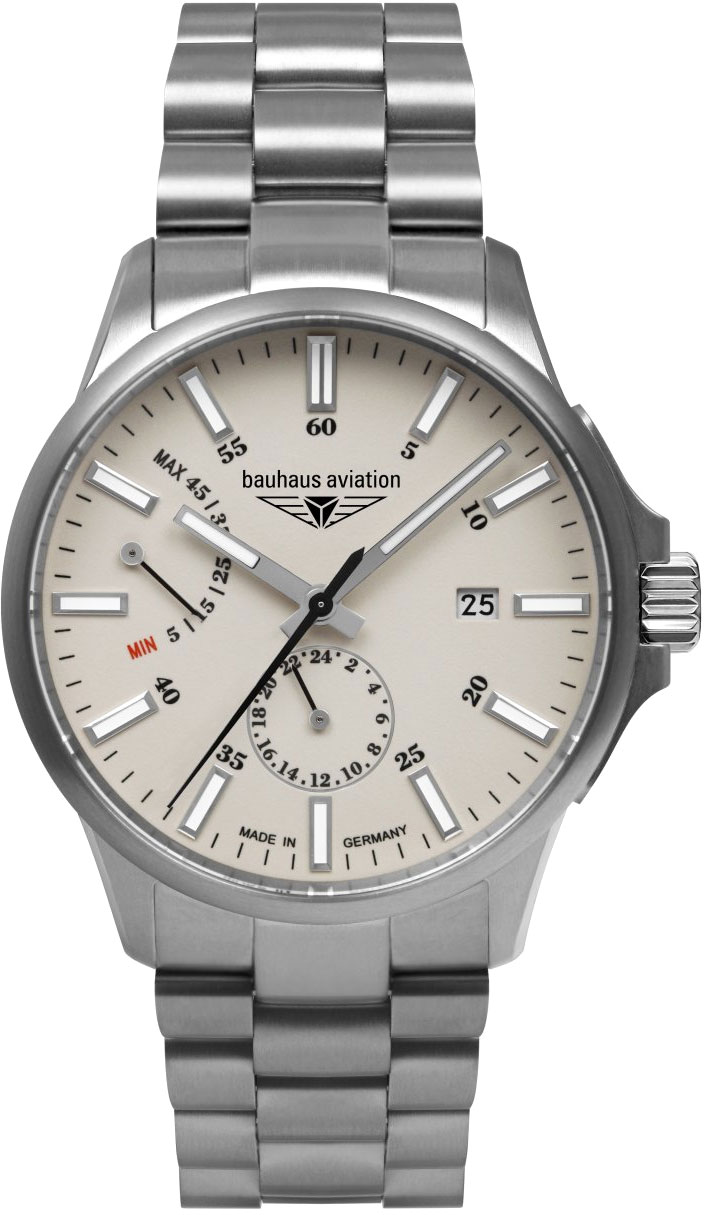 Этот аксессуар станет незаменимым помощником не только для пилотов, но и для любителей активного образа жизни. Водонепроницаемые мужские наручные часы. В механизме 26 камней. Круглый титановый корпус. Прямоугольные стрелки в стиле Baton и весь циферблат с люминесцентным покрытием, которое светится в темноте после непродолжительной зарядки на свету. Метки в виде штрихов. 12-ти и 24-х часовой формат времени отображается на отдельном циферблате. Окошко даты находится в положении 3 часа. Ретроградный указатель запаса хода. Рифленая заводная головка с защитой. Завинчивающаяся прозрачная задняя крышка. Титановый браслет.