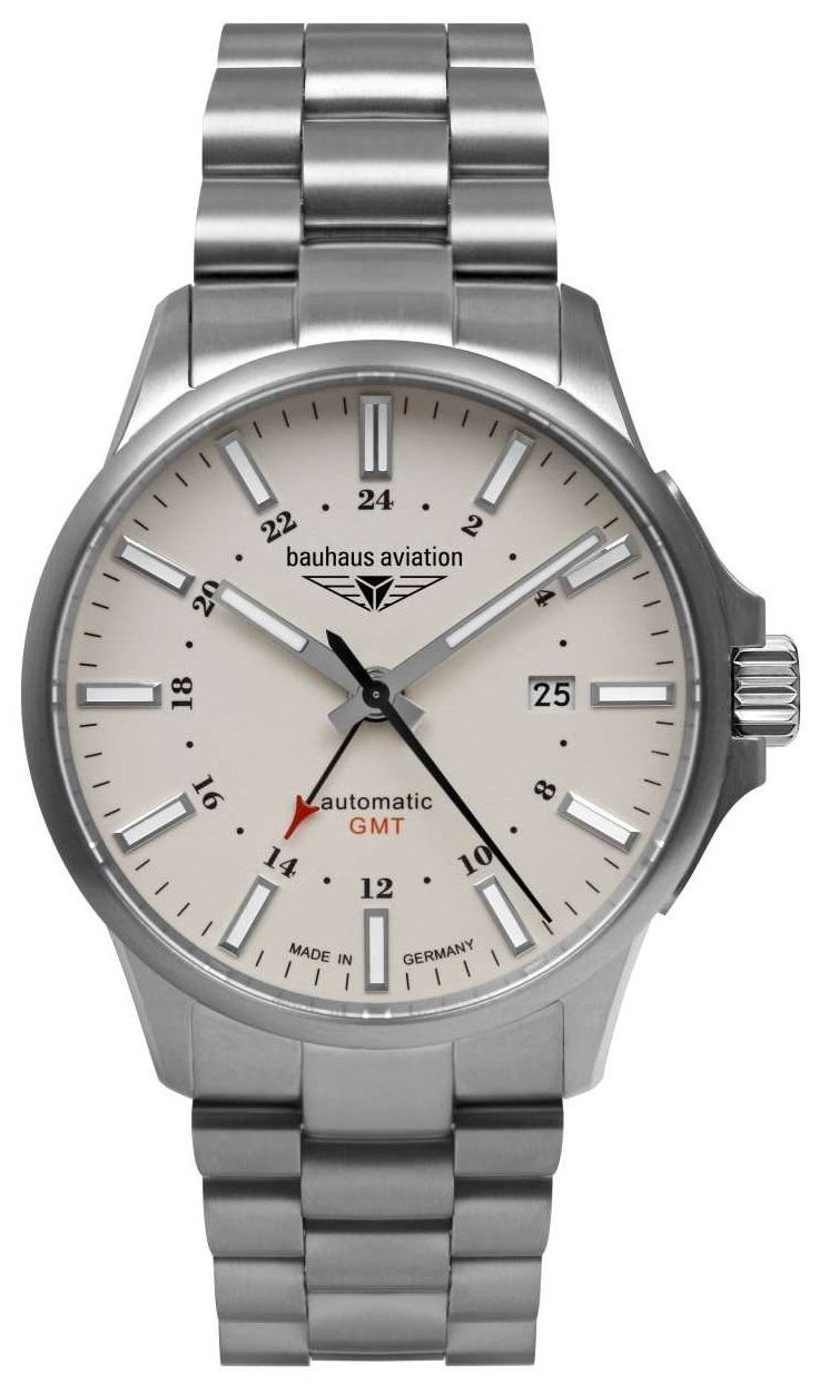 Этот аксессуар станет незаменимым помощником не только для пилотов, но и для любителей активного образа жизни. Автоматические оригинальные наручные часы. В механизме 24 камня. Круглый титановый корпус. Прямоугольные стрелки в стиле Baton и весь циферблат с люминесцентным покрытием, которое светится в темноте после непродолжительной зарядки на свету. Метки в виде штрихов. 12-ти и 24-х часовой формат времени. Окошко даты находится в положении 3 часа. Функция GMT. Рифленая заводная головка с защитой. Завинчивающаяся прозрачная задняя крышка. Титановый браслет.