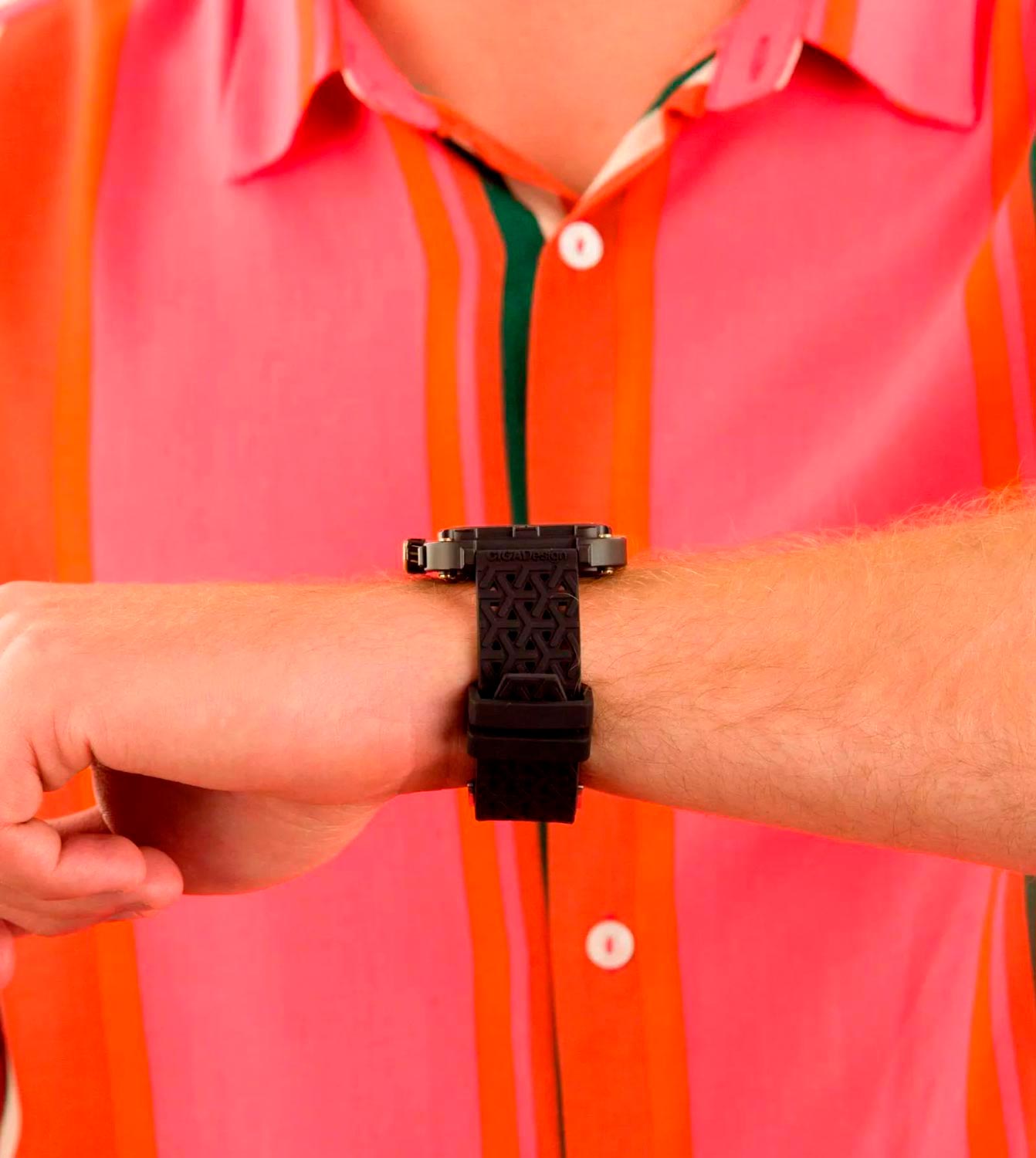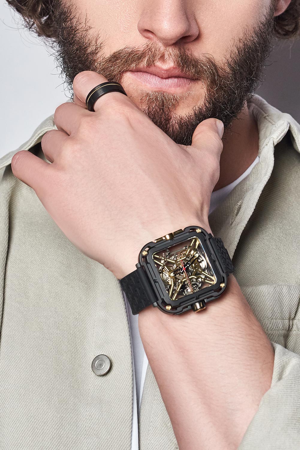 Превосходные часы со стремлением к свободе непременно побудят вас заниматься любимым делом. Дикие и авангардные скелетонизированные часы Series X Gorilla Titanium. Закругленный квадратный корпус из титана с DLC-покрытием. В механизме 25 камней, частота 21600 полуколебаний в час. Запас хода 40 часов. Двухслойная конструкция корпуса включает в себя внешний контур, соединенный со ступенчатым внутренним корпусом с помощью четырех амортизирующих пружин. Это первая ударопрочная система подвески, установленная в корпусе наручных часов. И подчеркивает эти пружины набор позолоченных винтов. Скрытая шкала времени идеально вписывается в корпус часов. Прорезиненная позолоченная заводная головка. Противоположная боковая панель корпуса украшена эмблемой гориллы. Сетчатый силиконовый ремешок с классической застежкой имеет функцию быстрой замены. В комплекте сменный нейлоновый ремешок с нанослойным покрытием. Фирменная подарочная упаковка.