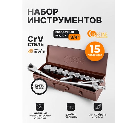 Набор инструментов FORSTIME 15 предметов 3/4 12гр FT-6143-9(63617)