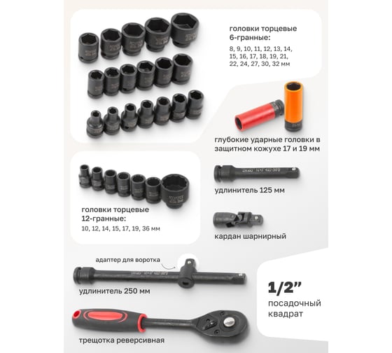 Набор инструментов Rockforce ударных 32 предмета 1/2" 6 граней, 10-32мм, Cr-Mo RF-4323-5MPB(54615)