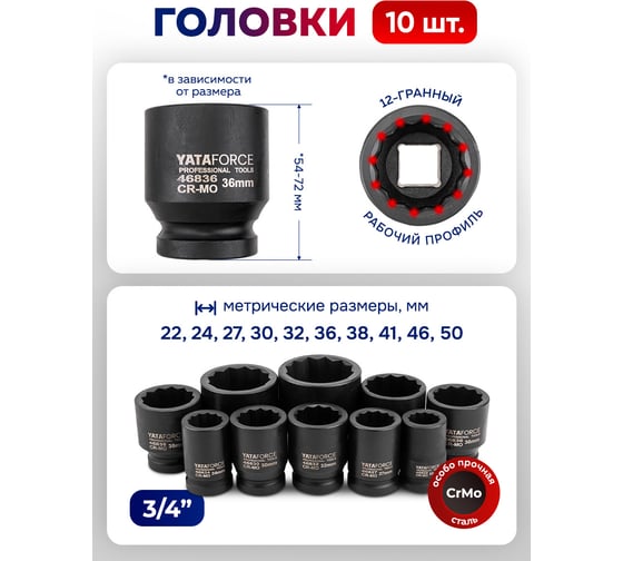- Посадочный размер трещотки3/4 дюйма