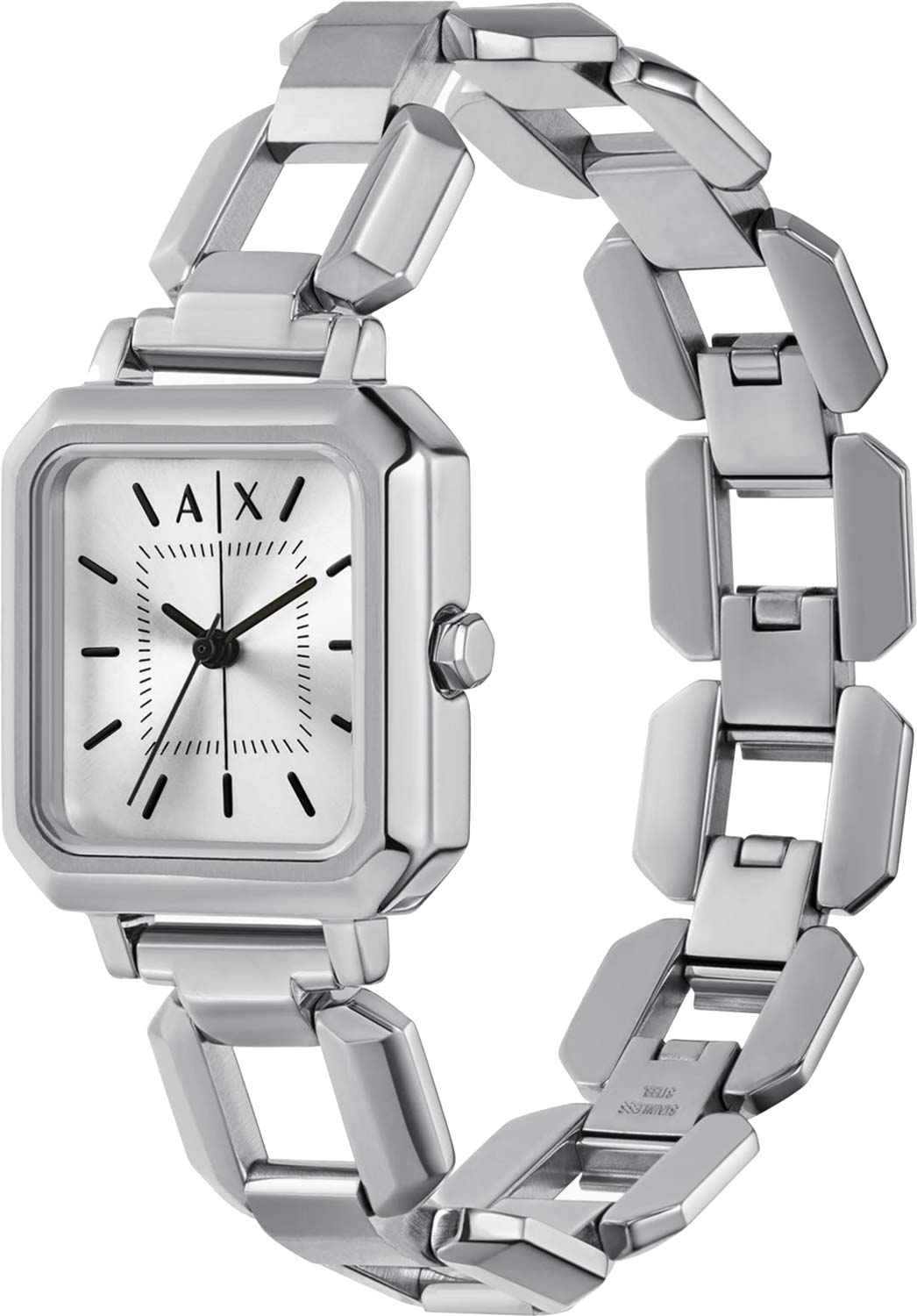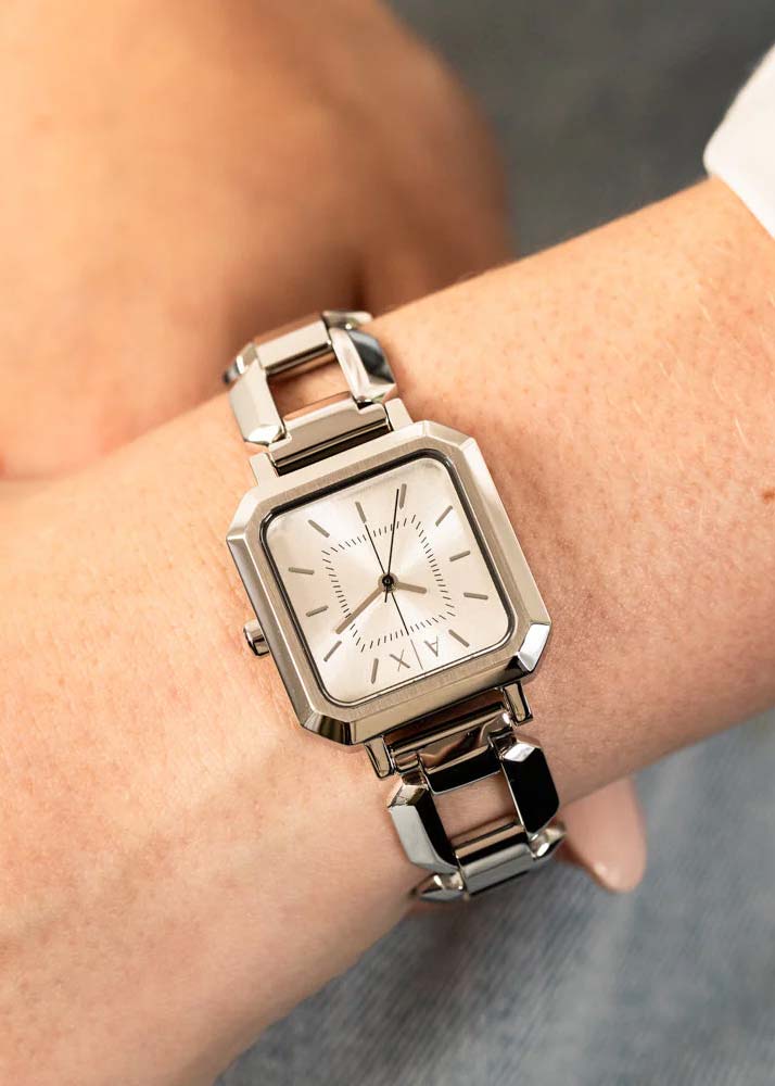 Leila. Женские кварцевые часы. Квадратный стальной корпус. Циферблат выполнен по технологии Sunray (солнечные лучи) и украшен накладным логотипом бренда. Метки в виде штрихов. Граненая заводная головка. Стальной браслет с раскладывающейся застежкой.