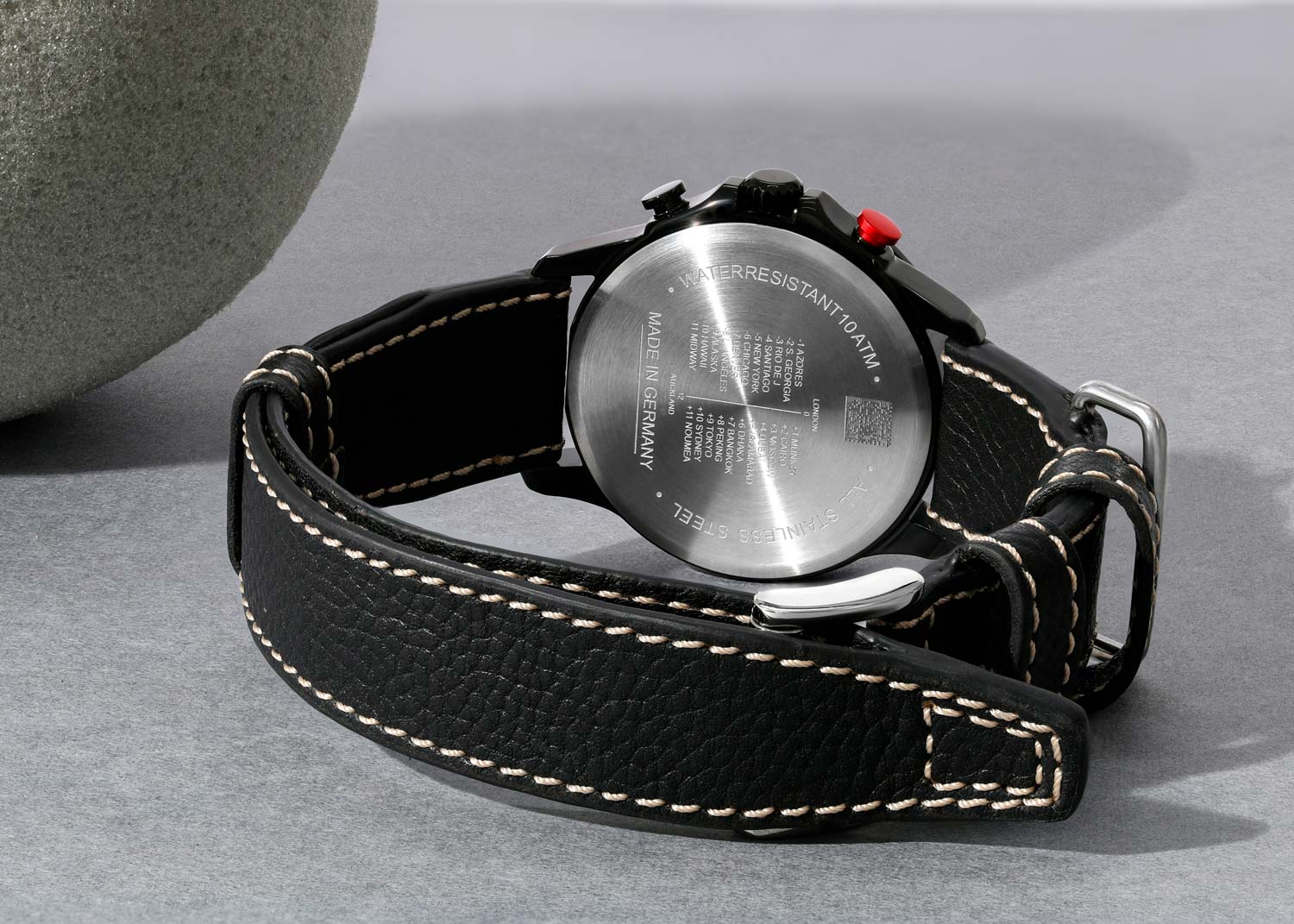 Мечевидные стрелки в стиле Sword. Метки и стрелки с люминесцентным покрытием, которое светится в темноте после непродолжительной зарядки на свету. Рифленая заводная головка с защитой. Удобный кожаный ремешок с декоративной белой строчкой.
