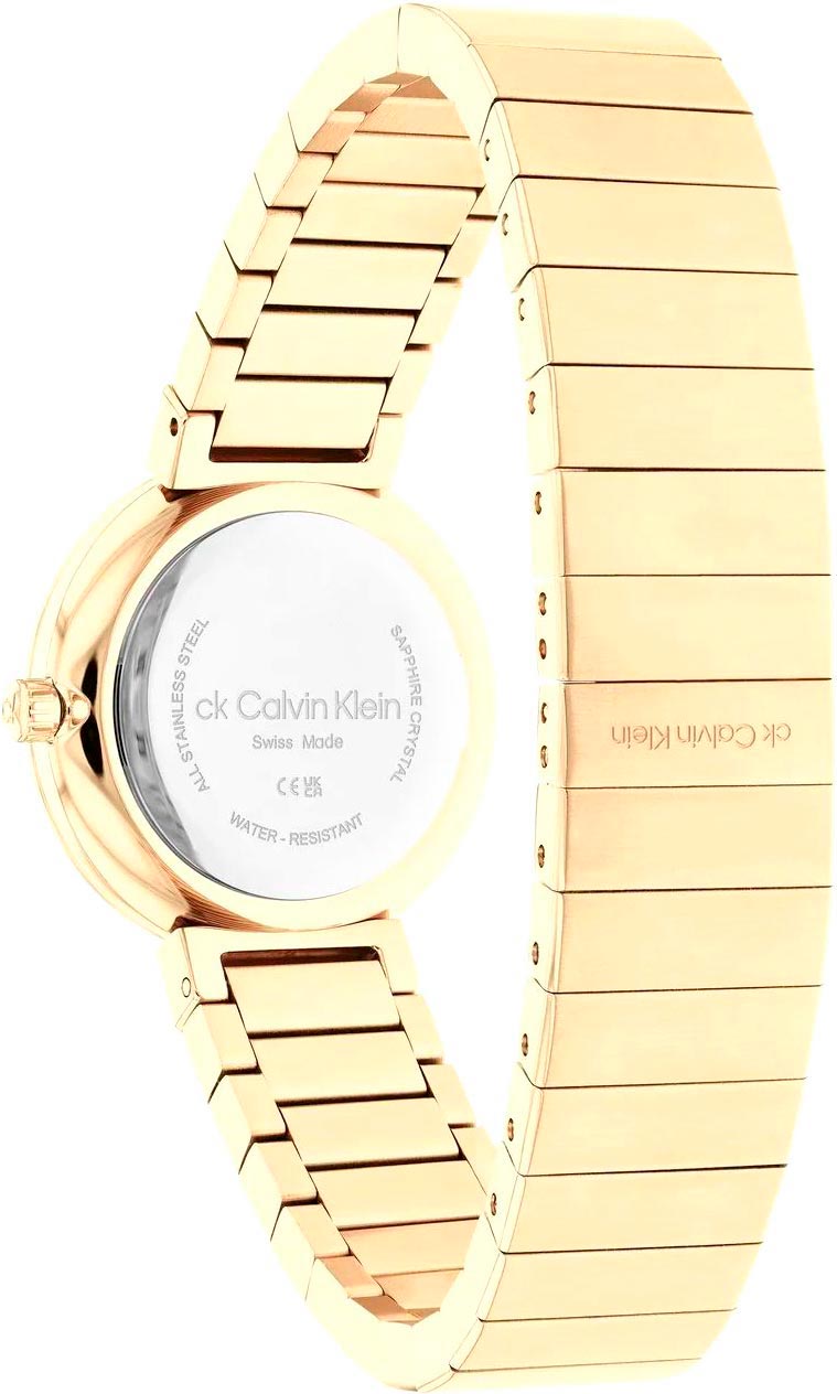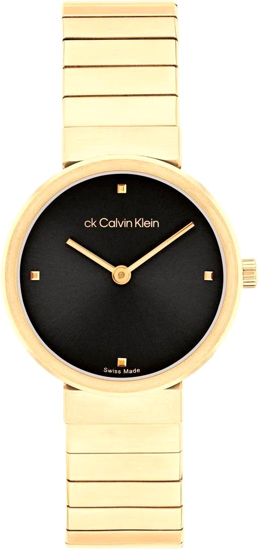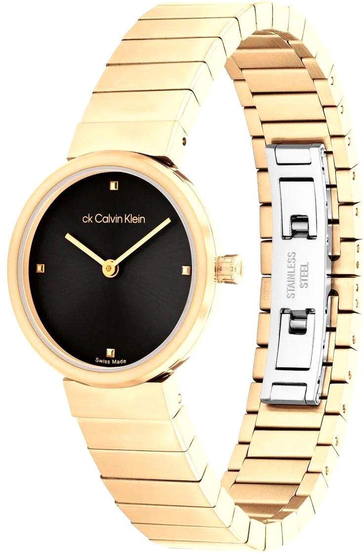 Превосходное сочетание классики и золота всегда великолепно смотрится на женской ручке. Женские наручные часы с круглым стальным корпусом Swiss Elegance. Циферблат выполнен по технологии Sunray (солнечные лучи) и украшен фирменным логотипом Calvin Klein. Накладные метки в виде точек. Заводная головка украшена логотипом ''ck''. Стальной браслет с раскладывающейся застежкой.