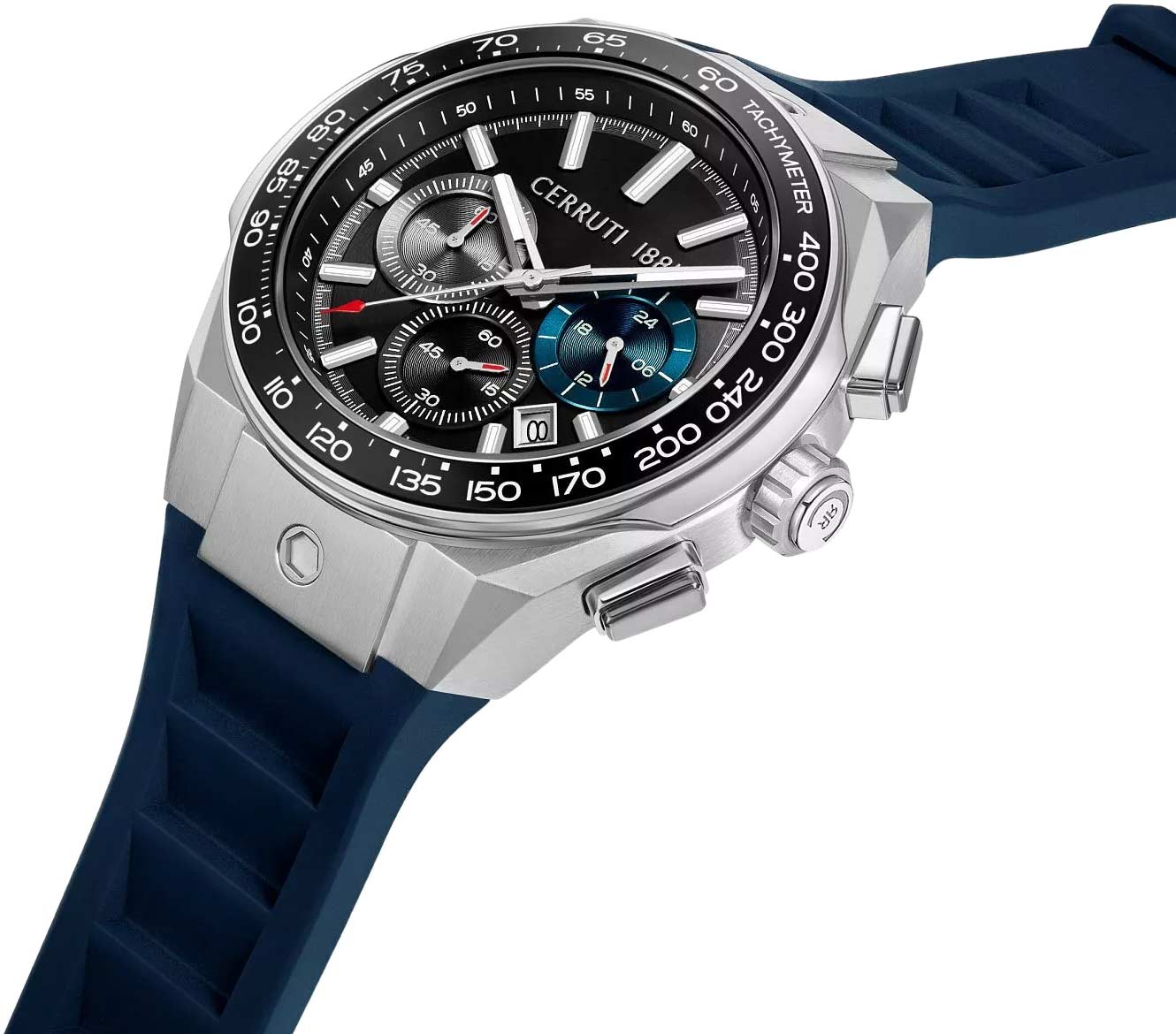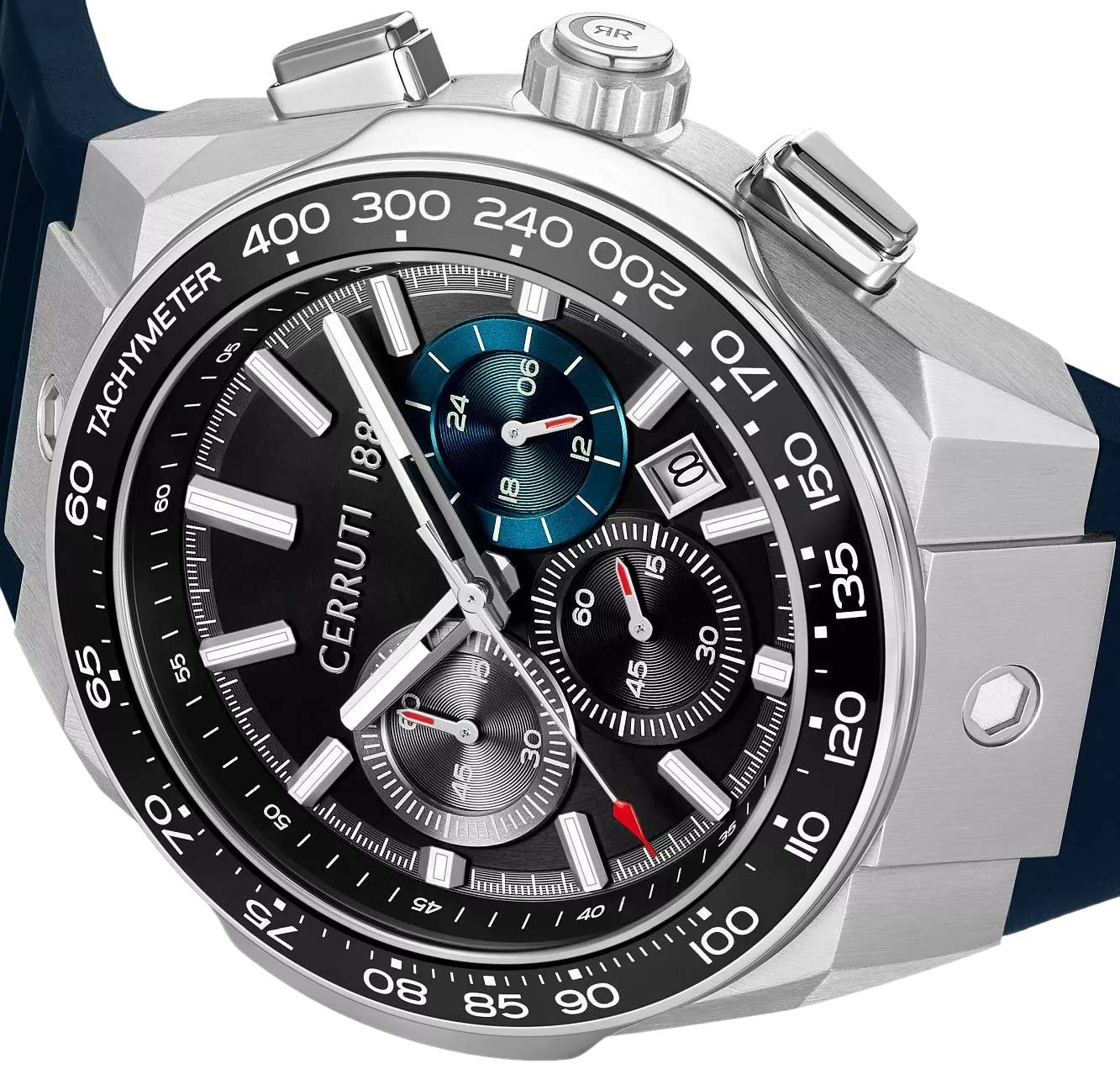 Мужские наручные часы-хронограф с секундомером и тахиметром. 12-ти и 24-х часовой формат времени. Круглый стальной корпус. Керамический безель. Циферблат выполнен по технологии Sunray (солнечные лучи). Метки в виде штрихов. Окошко даты находится между часовыми метками 4 и 5.