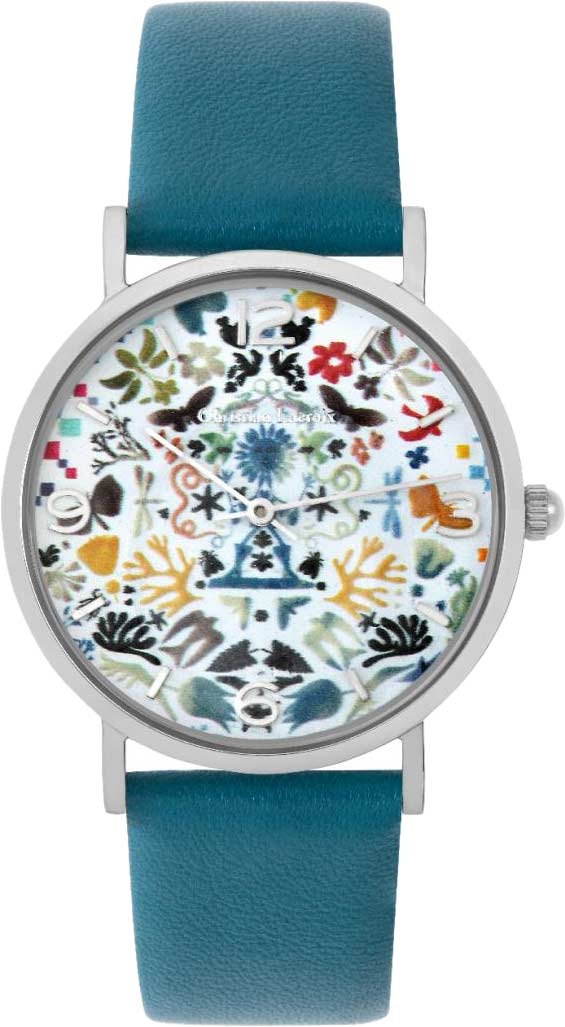 Женские наручные часы. Круглый корпус из нержавеющей стали. Циферблат с разноцветным изображением птиц, насекомых и растений защищен минеральным стеклом. Метки в виде штрихов и арабских цифр. Рифленая заводная головка. Кожаный ремешок с классической застежкой.