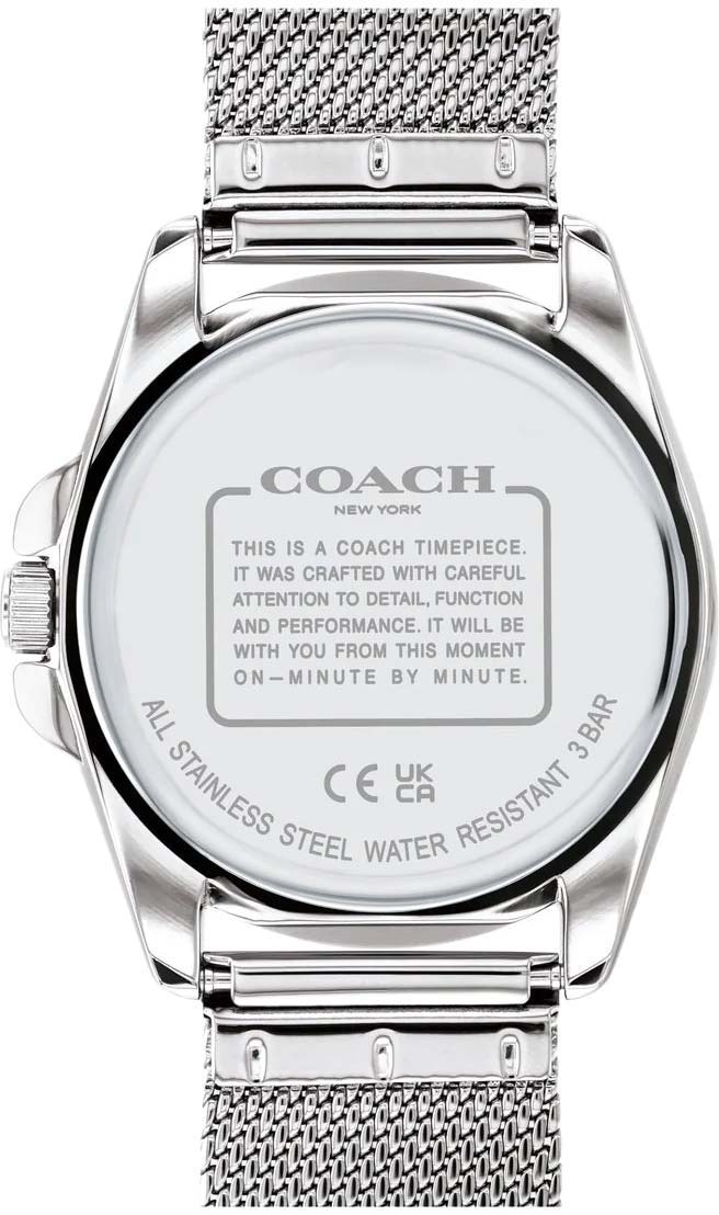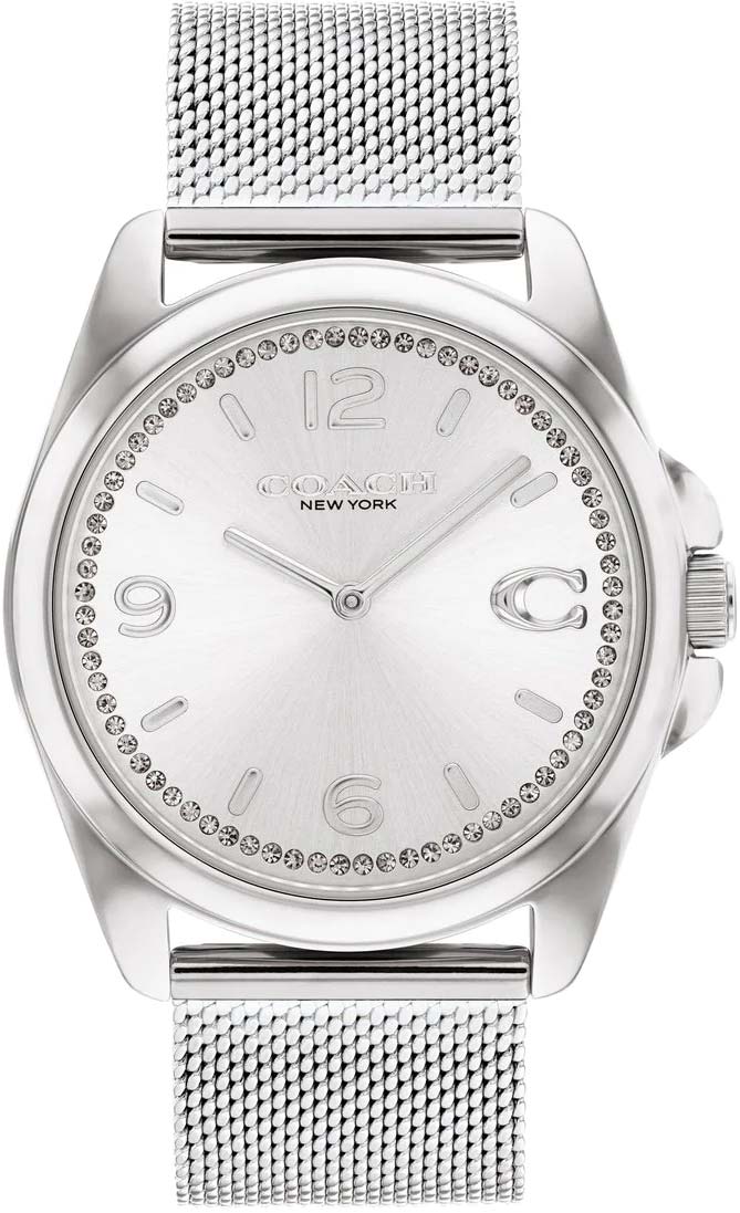 С этим аксессуаром на запястье каждая модница будет выглядеть стильно в любой обстановке. Женские часы с круглым стальным корпусом. Циферблат выполнен по технологии Sunray (солнечные лучи) и дополнен логотипом бренда. Метки в виде штрихов, арабских цифр 6, 9 и 12 и буквы ''C''. Рифленая заводная головка с защитой. На задней крышке обращение от COACH к своим клиентам. Стальной браслет миланского плетения.