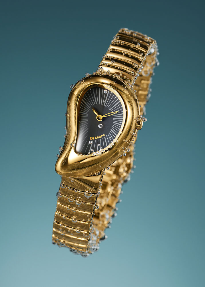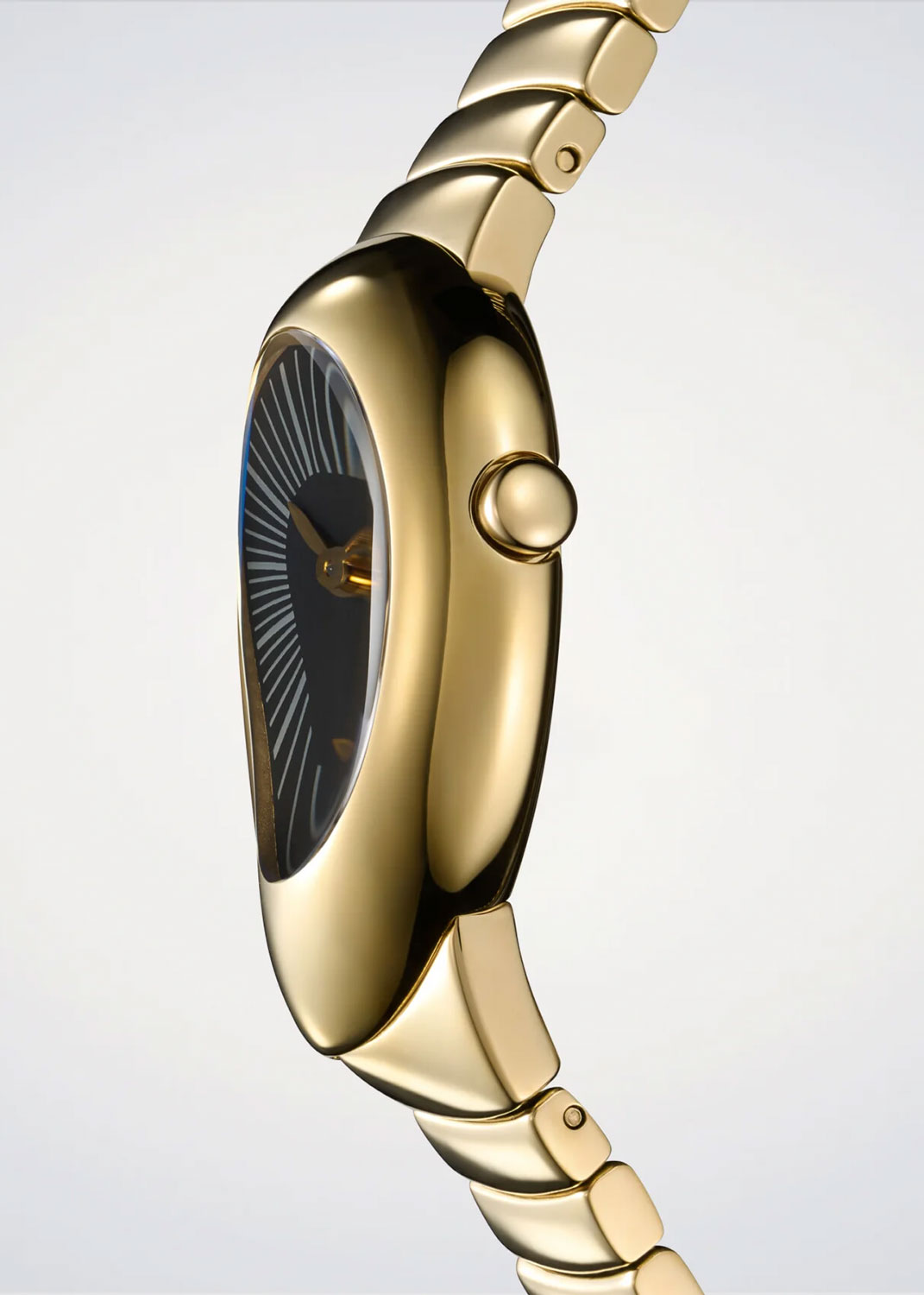 Женские часы Pure Essence. Стальной корпус в форме капли. Черный циферблат с метками в виде штрихов. Секундная стрелка отсутствует. Задняя крышка крепится на 4-х винтах. Стальной браслет с раскладывающейся застежкой.