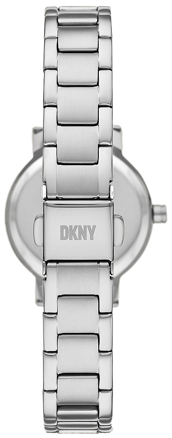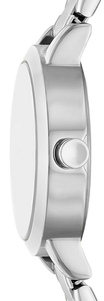 Аксессуар с интересными штрихами в дизайне добавит изюминку в ваш стильный образ. Женские часы в круглом стальном корпусе. Циферблат украшен логотипом бренда. Метки в виде точек. Стальной браслет с раскладывающейся застежкой.