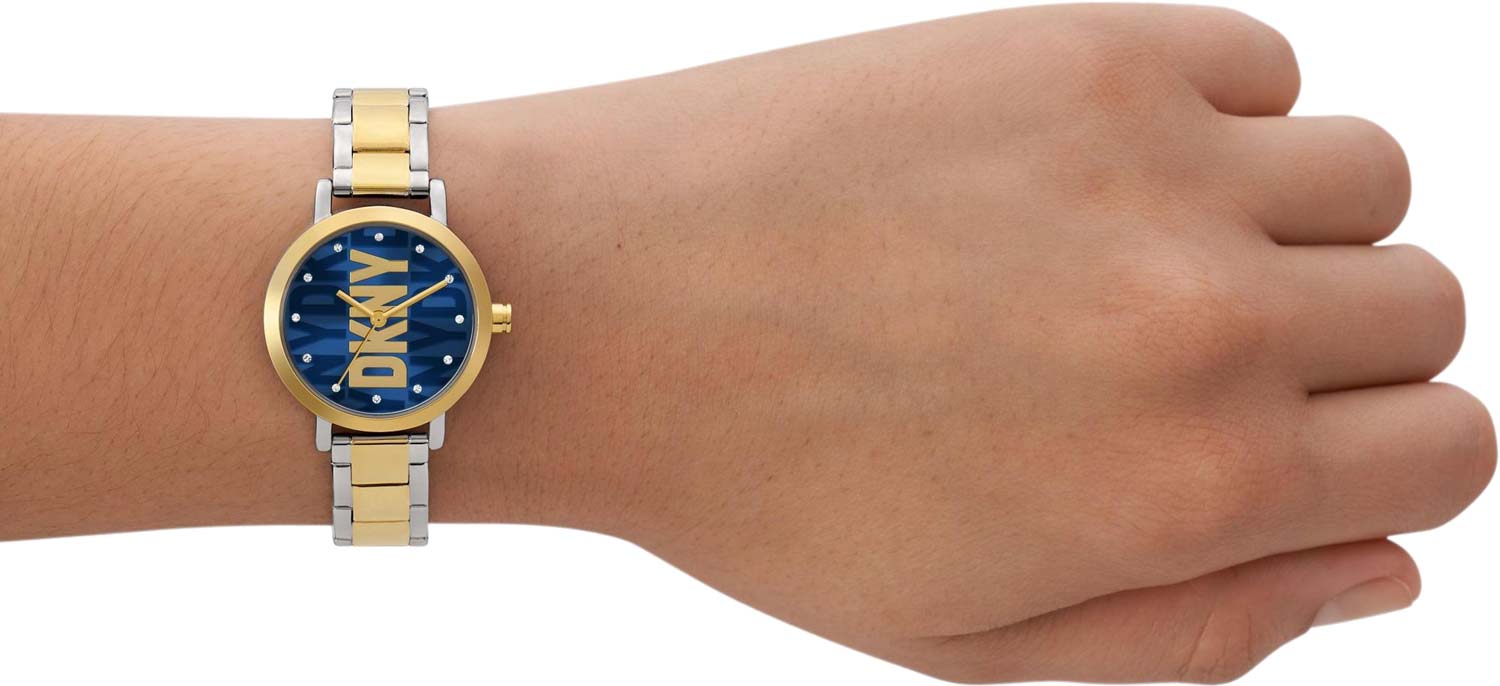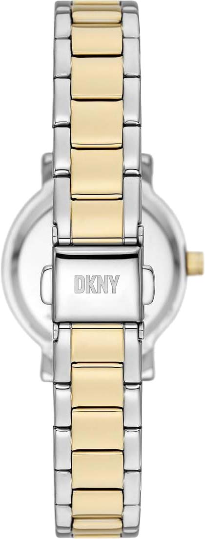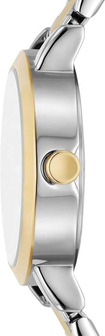 Аксессуар с интересными штрихами в дизайне добавит изюминку в ваш стильный образ. Женские часы с круглым стальным корпусом. Циферблат украшен логотипом бренда. Метки в виде точек, инкрустированных кристаллами. Стальной браслет с раскладывающейся застежкой.