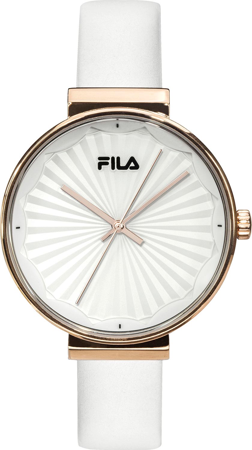 Женские наручные кварцевые часы. Круглый стальной корпус с сатинированной отделкой. Циферблат с узором в виде лучей украшен фирменным логотипом. Метки в виде штрихов. Тонкие прямоугольные стрелки в стиле Baton. Оригинальная секундная стрелка. Минеральное стекло. Рифленая заводная головка. Кожаный ремешок с классической застежкой.