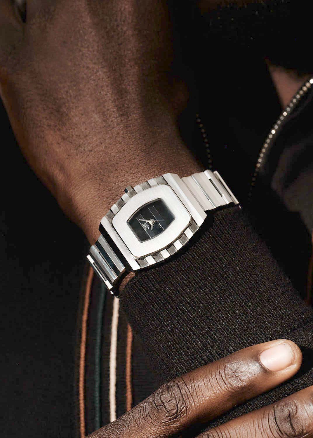 Циферблат без меток украшен фирменным логотипом. Мечевидные стрелки в стиле Sword. Граненая заводная головка. Стальная задняя крышка крепится на 4-х винтах. Стальной браслет с раскладывающейся застежкой.