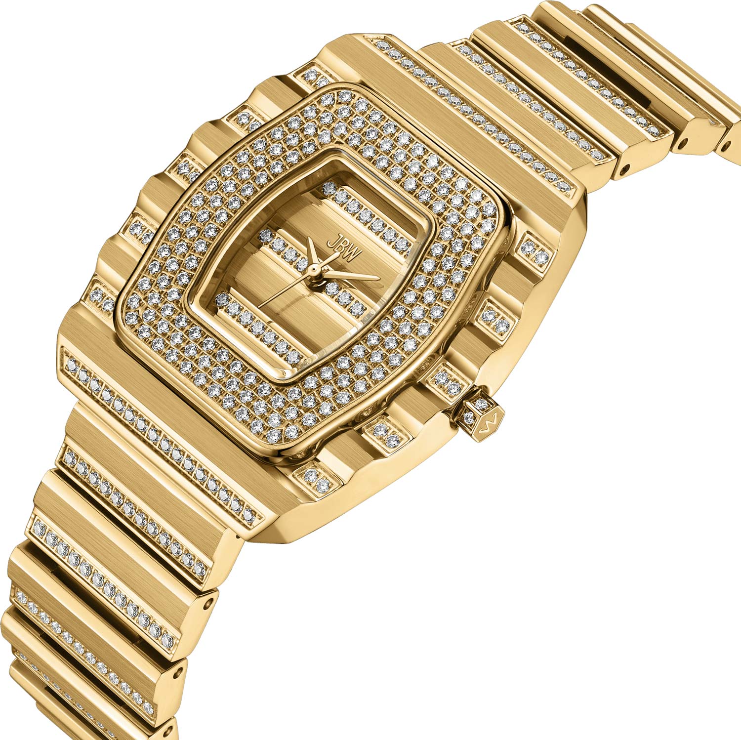 Atlas. Унисекс наручные часы. Стальной рифленый корпус в форме бочки. Корпус и браслет украшены строчками из кристаллов. Безель украшен паве из кристаллов. Дизайн корпуса и браслета выполнен паттерном, который чередует полированную и матовую отделку.