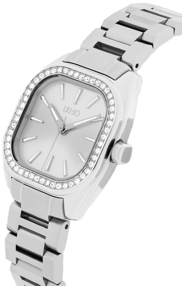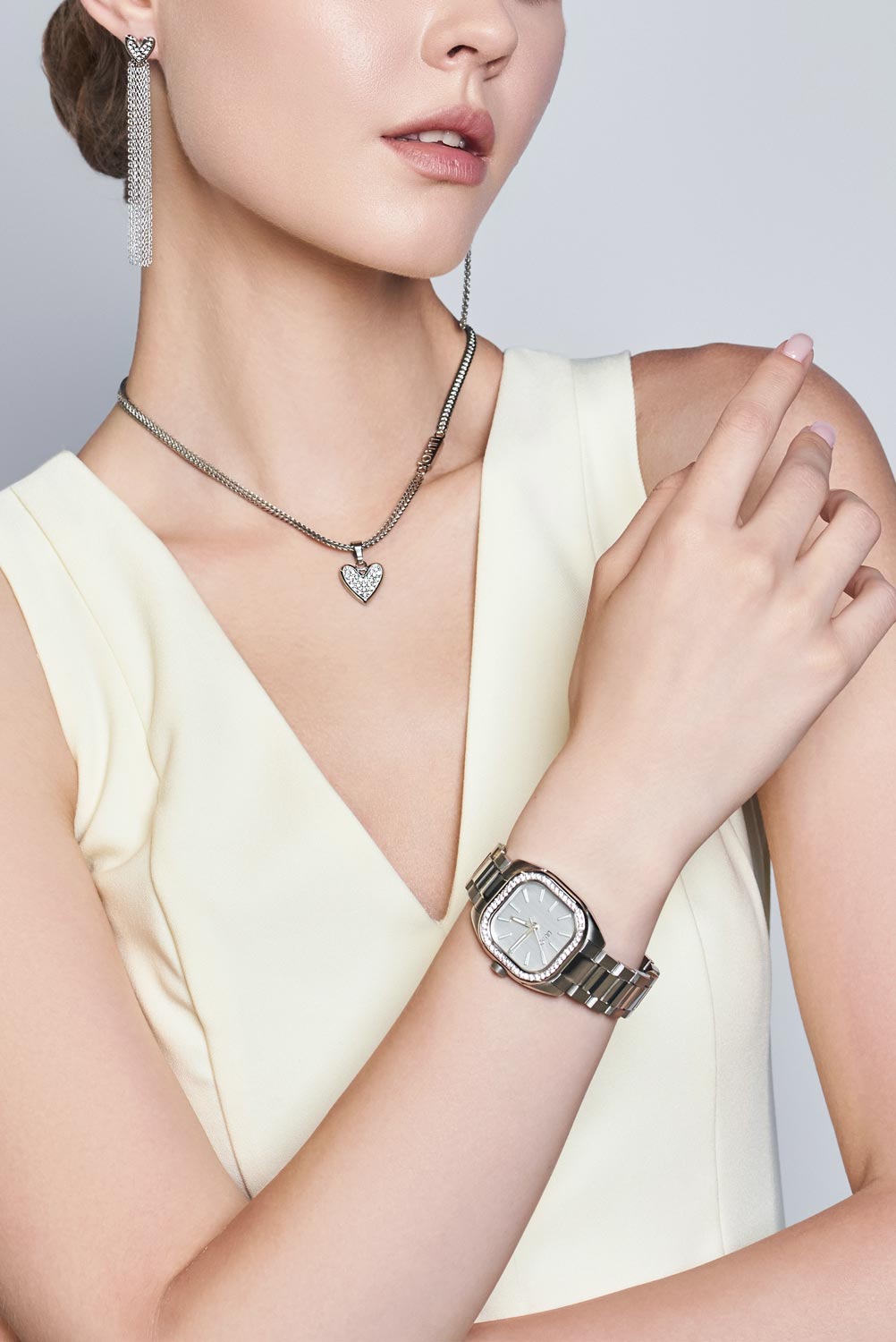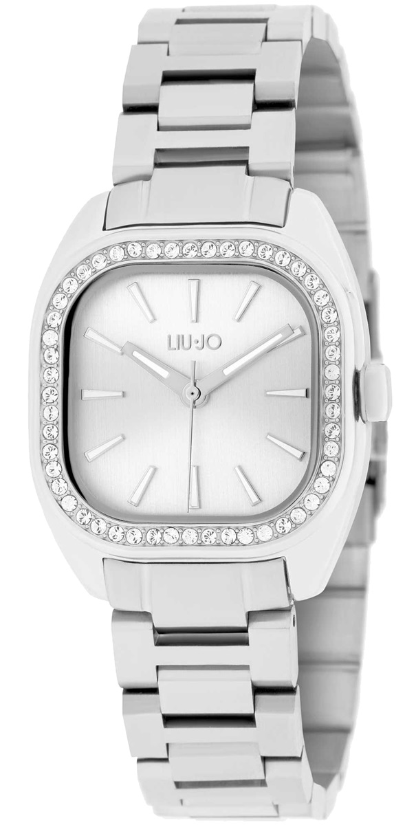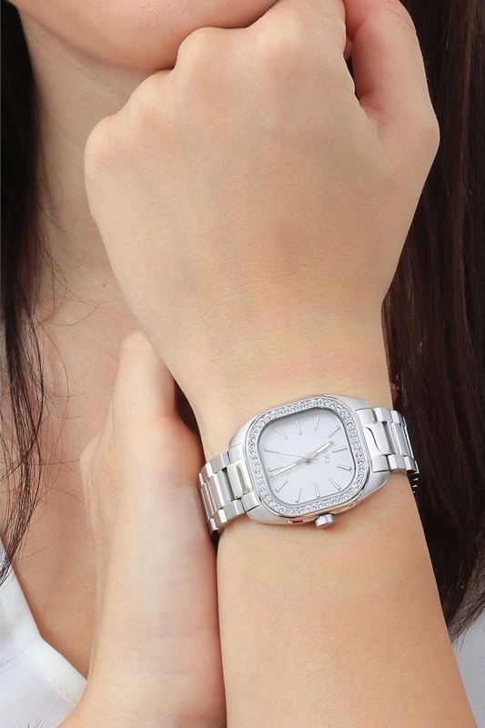 Стильные и яркие часы выступят отличным дополнением к нарядам истинной модницы. Женские кварцевые часы с квадратным корпусом, украшенным кристаллами. Метки в виде штрихов. Браслет с раскладывающейся застежкой.