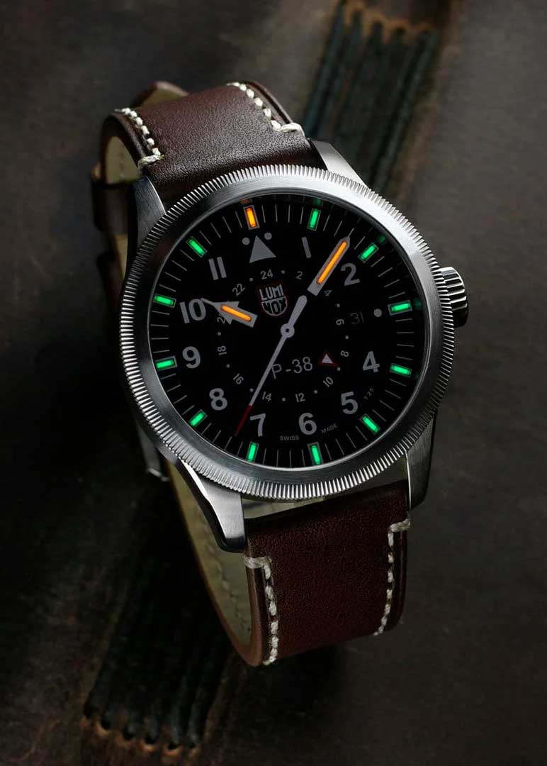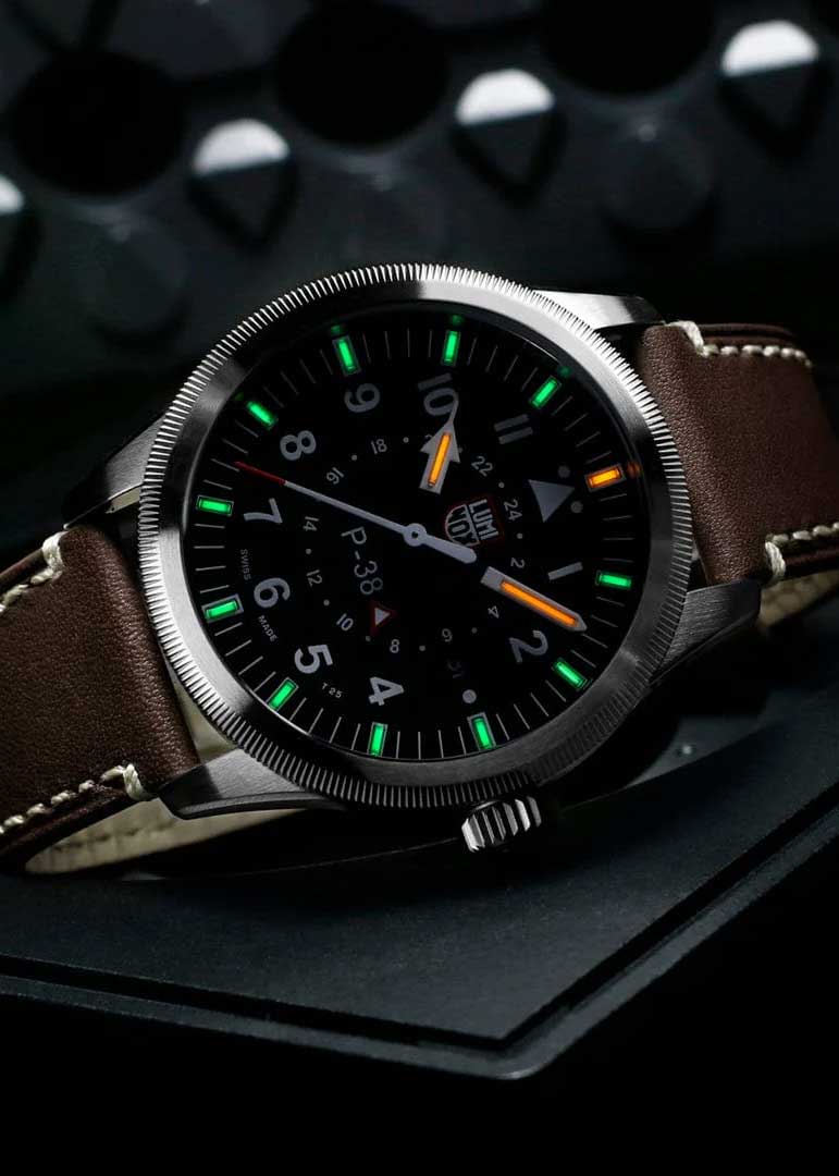 P-38 Lightning. Мужские часы. Модель вдохновлена часами для пилотов B-Uhr 1940-х годов. Второй часовой пояс в 24-х часовом формате времени отображается центральной стрелкой.
