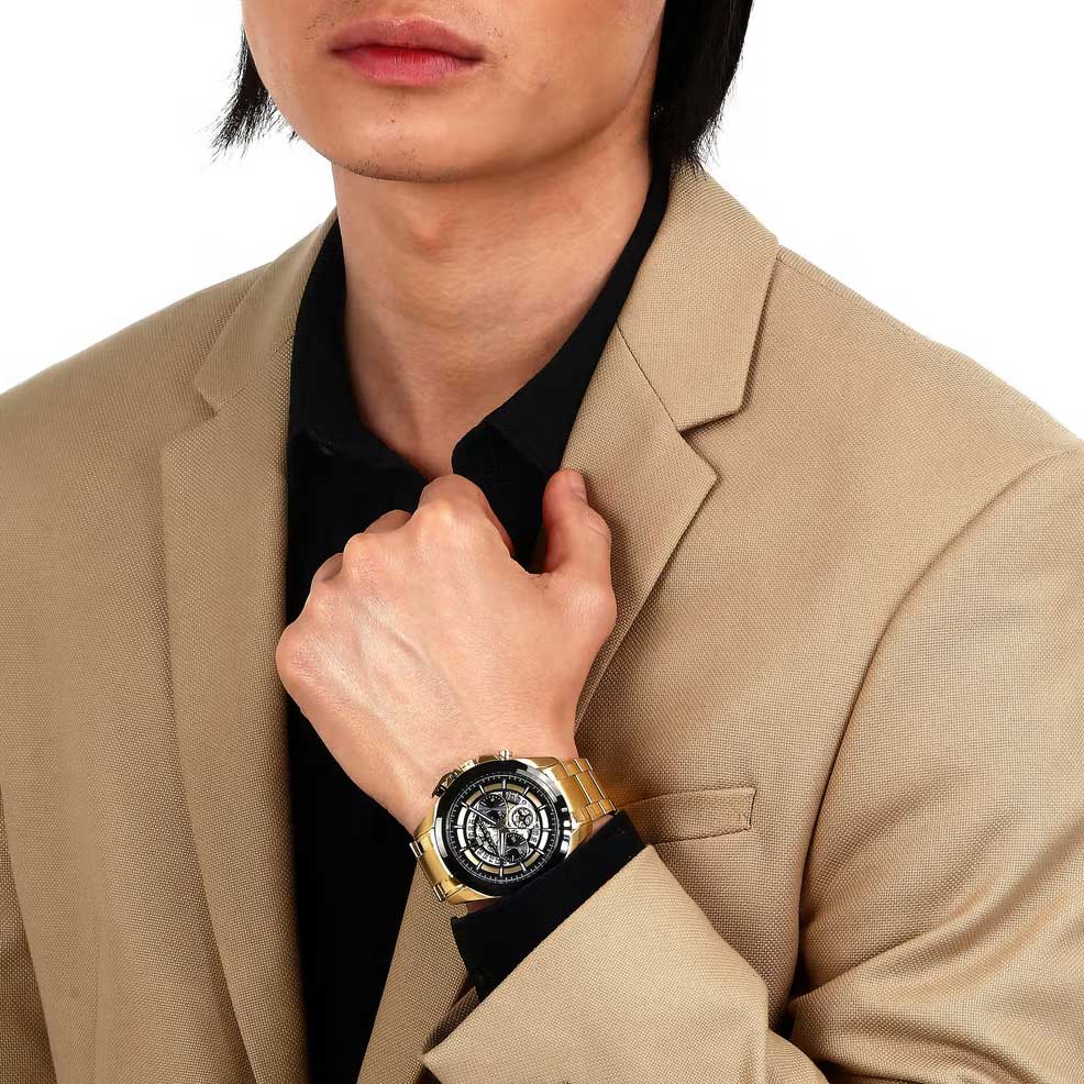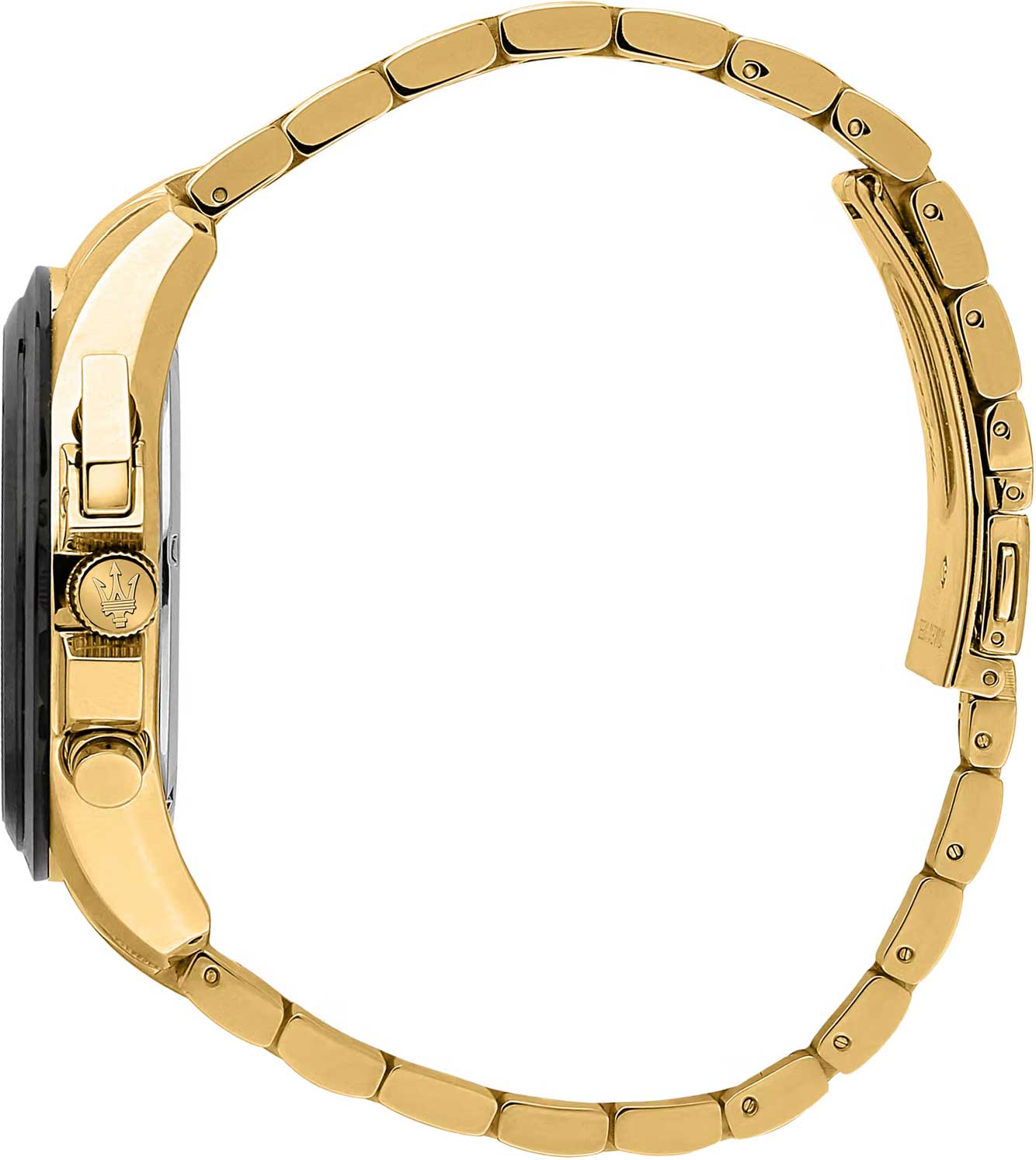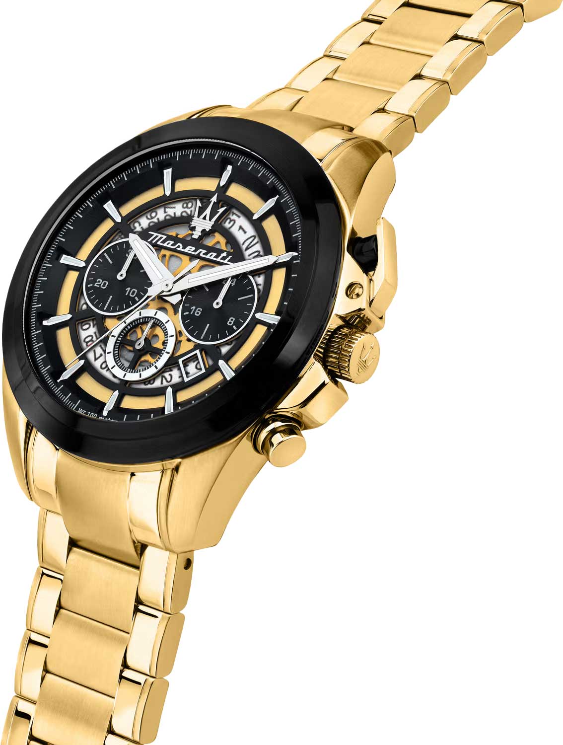 Скелетонизированные часы-хронограф с секундомером. 12-ти и 24-х часовой формат времени. Циферблат с метками в виде штрихов украшен фирменным логотипом «Maserati». Окошко даты находится в положении между отметками 4 и 5 часов. Безель с IP покрытием. Завинчивающаяся задняя крышка и заводная головка с защитой. Браслет с раскладывающейся застежкой.
