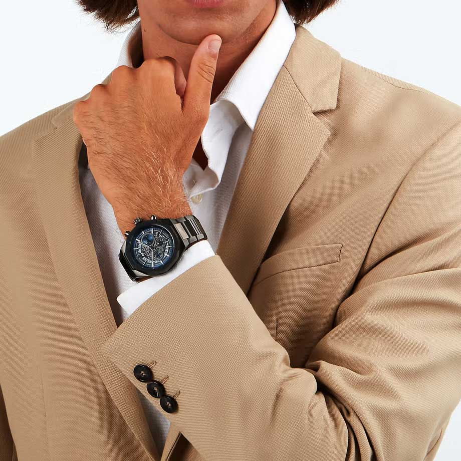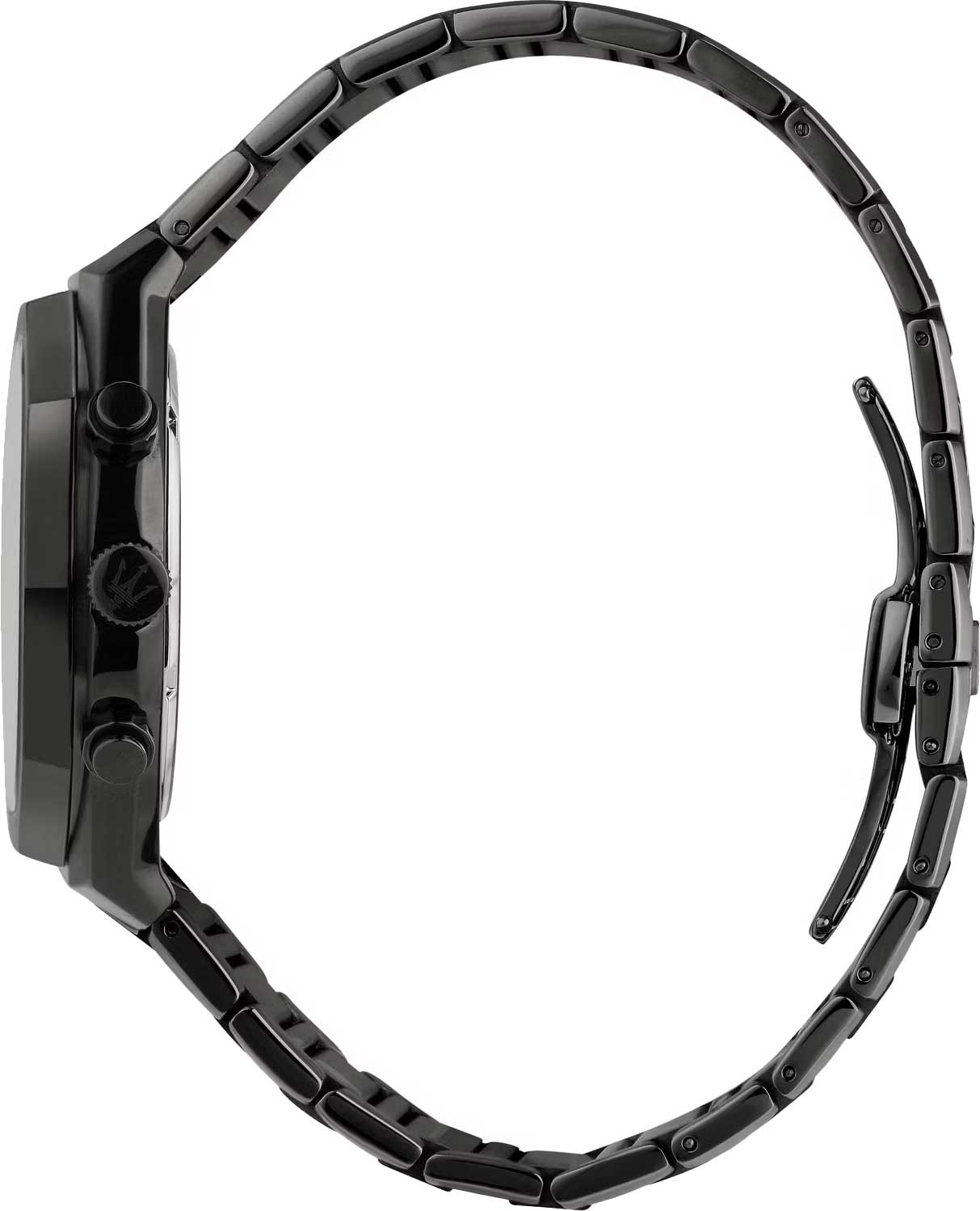 Скелетонизированные часы-хронограф с секундомером. 12-ти и 24-х часовой формат времени. Циферблат с метками в виде штрихов украшен фирменным логотипом «Maserati». Окошко даты находится в положении между отметками 4 и 5 часов. Завинчивающаяся задняя крышка и заводная головка. Браслет с раскладывающейся застежкой.