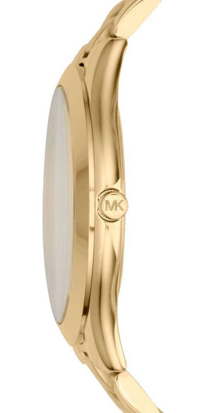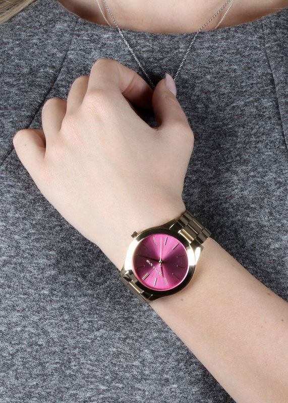 Женские кварцевые часы Runway Slim. Круглый стальной корпус. Метки в виде штрихов. Клиновидные стрелки в стиле Dauphine. Рифленая заводная головка. Стальной браслет с раскладывающейся застежкой.
