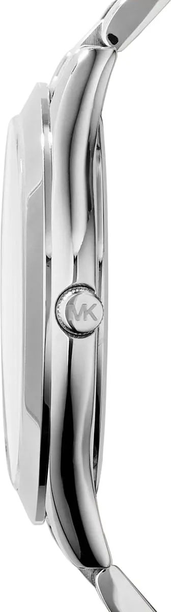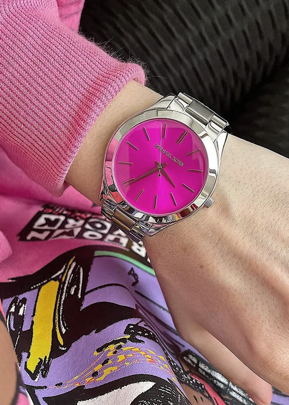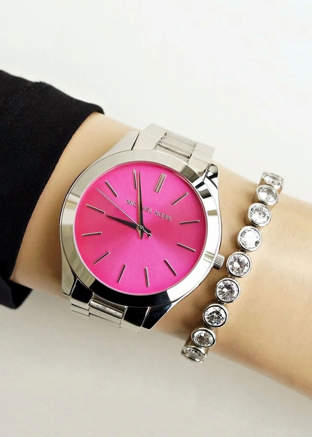 Женские кварцевые часы Runway Slim. Круглый стальной корпус. Циферблат выполнен по технологии Sunray (солнечные лучи) и защищен минеральным стеклом. Метки в виде штрихов. Клиновидные стрелки в стиле Dauphine. Рифленая заводная головка. Стальной браслет с раскладывающейся застежкой.
