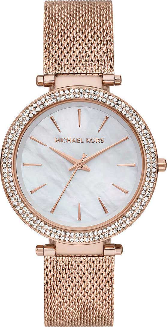 Darci. Женские часы с круглым стальным корпусом. Перламутровый циферблат с метками в виде штрихов. Безель украшен паве из кристаллов. Рифленая заводная головка. Браслет миланского плетения.
