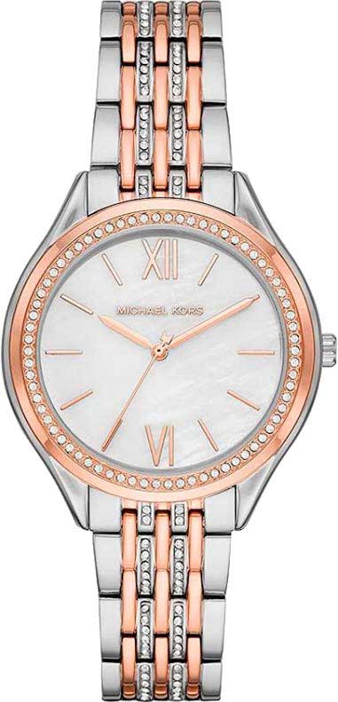 Женские кварцевые часы. Круглый стальной корпус с частичным розовым PVD покрытием украшен кристаллами. Циферблат защищен минеральным стеклом. Метки в виде римских цифр и штрихов. Заводная головка. Стальной браслет с частичным розовым PVD покрытием и раскладывающейся застежкой украшен кристаллами.