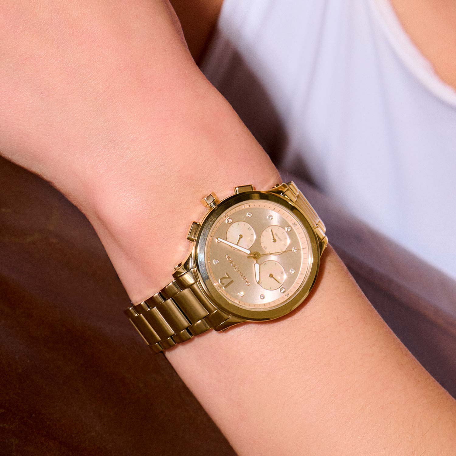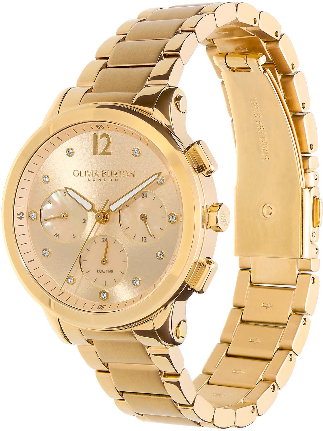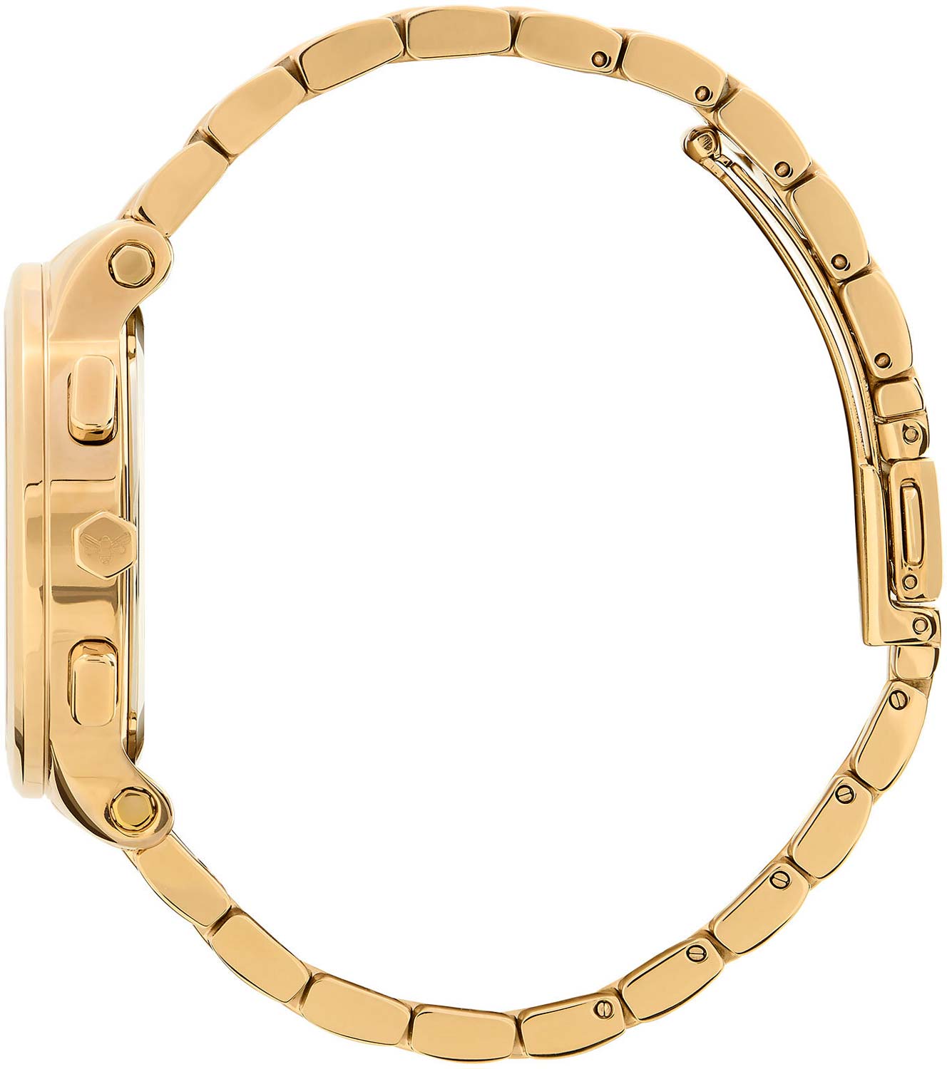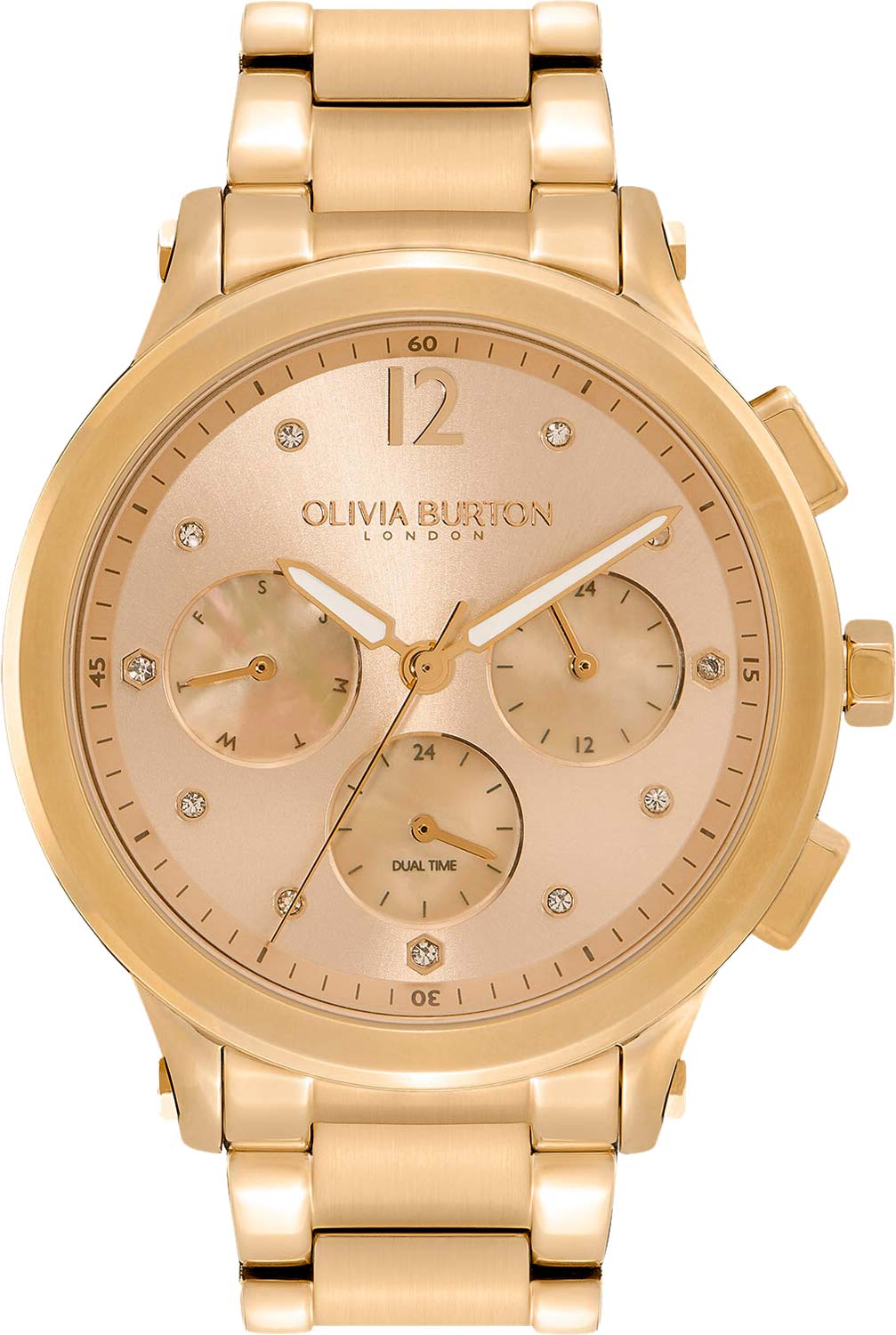 Эти часы сочетают в себе шикарную эстетику золотистого металла с функциональным циферблатом. Женские часы с круглым стальным корпусом. 12-ти и 24-х часовой формат времени. Второй часовой пояс. Циферблат выполнен по технологии Sunray (солнечные лучи). Время в 24-х часовом формате и день недели вынесены на отдельные перламутровые циферблаты. Метки в виде точек, украшенных кристаллами, и арабской цифры 12. Шестигранная заводная головка. Браслет с раскладывающейся застежкой.