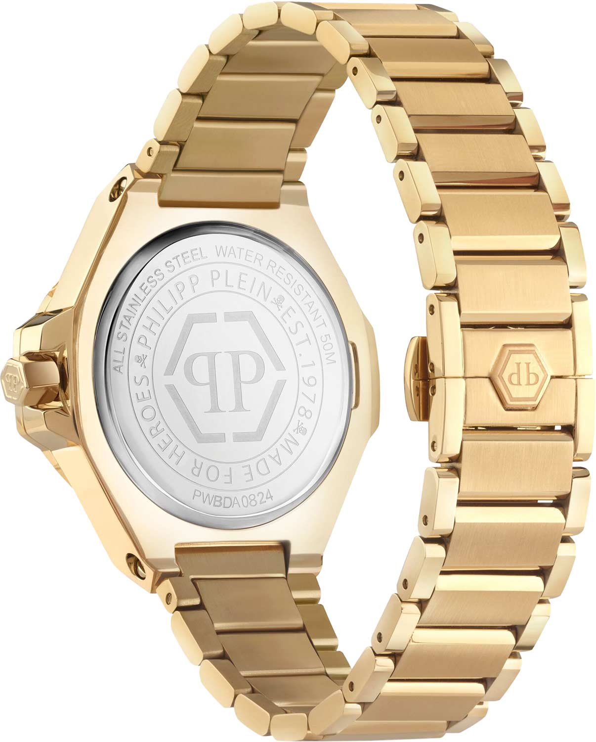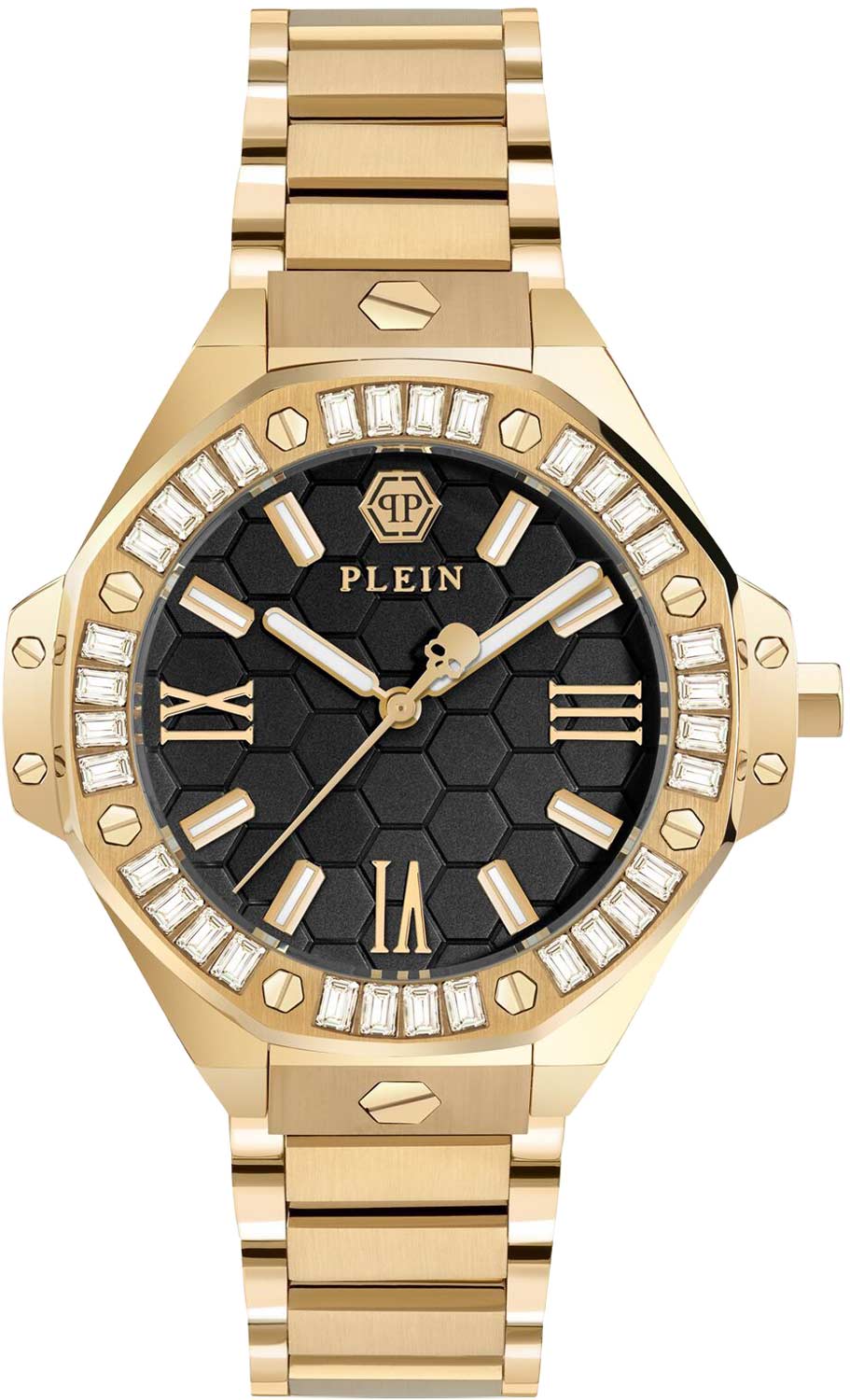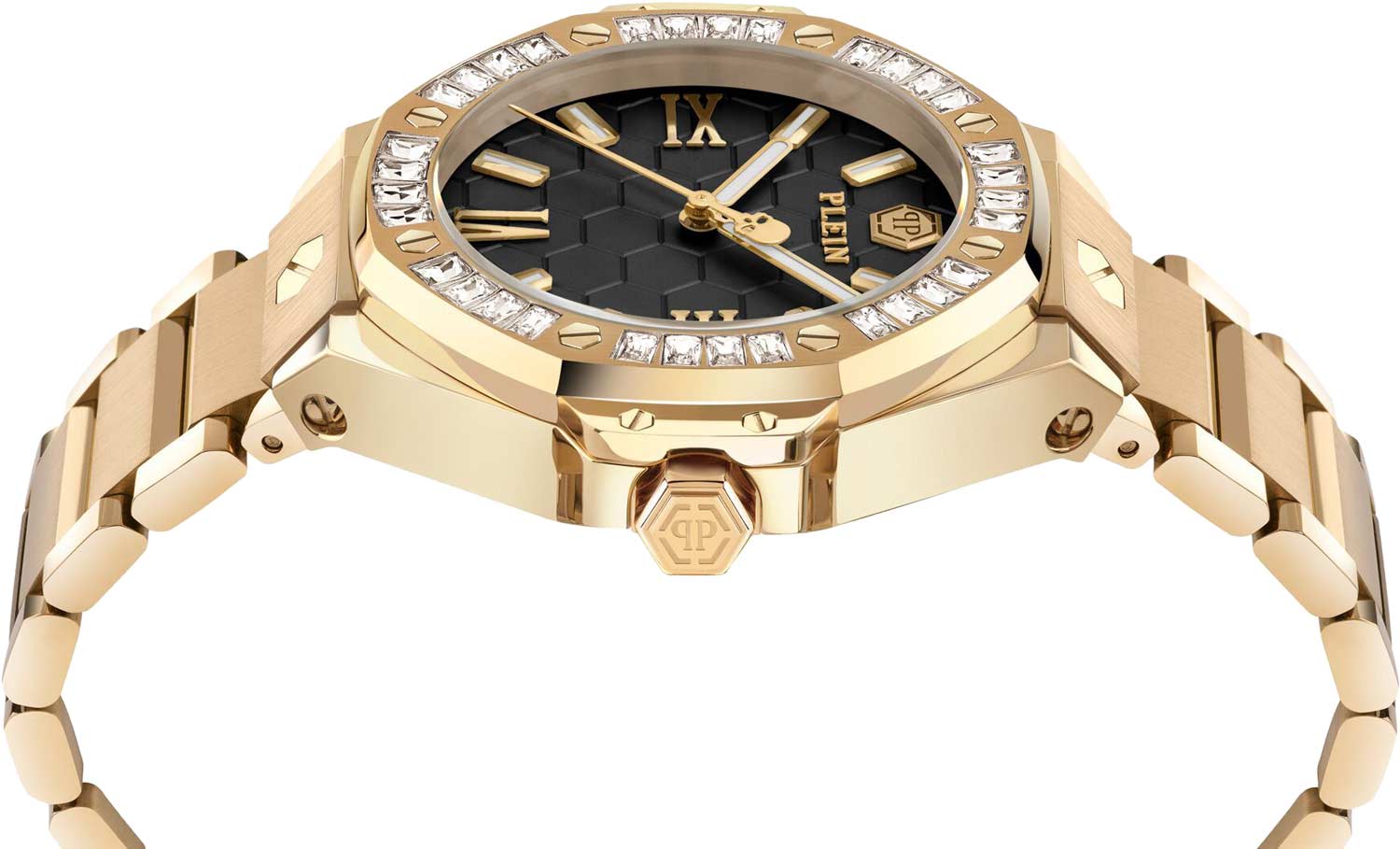 Plein Lady Royal — акцентный череп и культовые шестигранные винты подчеркивают наследие бренда. Женские наручные часы. Стальной корпус. Безель украшен кристаллами Preciosa. Циферблат дополнен сотовым декоративным узором и логотипом бренда в положении 12 часов. Метки в виде штрихов и римских цифр. Секундная стрелка дополнена черепом. Шестигранная заводная головка. Крышка корпуса с гравировкой ''Philipp Plein est. 1978. Made for Heroes'' (Philipp Plein основан в 1978 году. Созданы для героев). Стальной браслет с раскладывающейся застежкой.