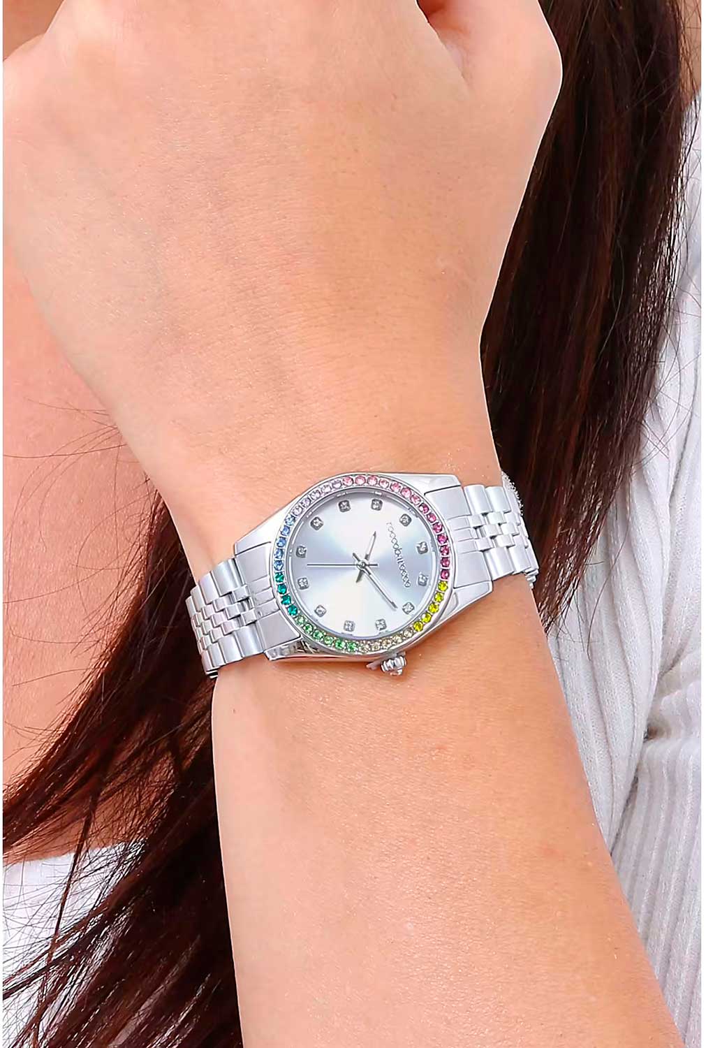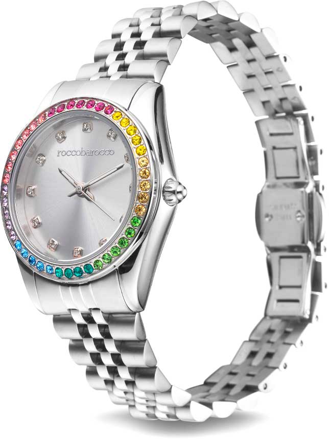 Практичные часы с радужными кристаллами украсят ваш образ в повседневной жизни. Кварцевые наручные женские часы. Круглый стальной корпус украшен радужными кристаллами. Циферблат выполнен по технологии Sunray (солнечные лучи). Накладные метки в виде точек, украшенных кристаллами. Заостренные прямоугольные стрелки в стиле Baton с люминесцентным покрытием, которое светится в темноте после непродолжительной зарядки на свету. Рифленая заводная головка. Надежный стальной браслет матовой и полированной отделки с раскладывающейся застежкой.