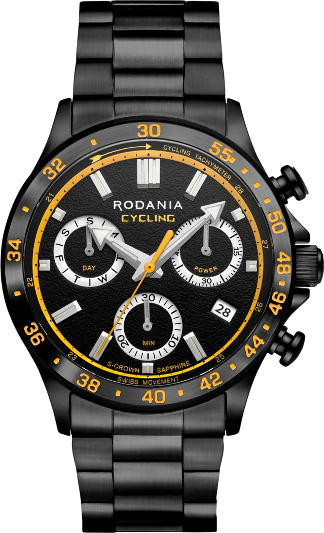 Часы-хронограф Chronograph Cycling Limited Edition с секундомером и тахиметром. Лимитированная серия для любителей велоспорта. Оснащен 30-минутным счетчиком, центральной секундной стрелкой (1/1 сек) и функциями Add & Split — идеально подходит для отслеживания промежуточных результатов. Двойная тахиметрическая шкала измеряет скорость от 55 до 20 км/ч, что соответствует типичным условиям велогонок.