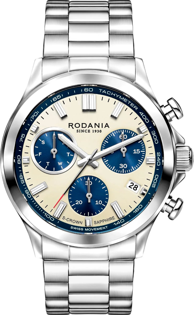 Часы-хронограф Verbier с секундомером и тахиметром. Метки в виде штрихов. День недели отображается на отдельном циферблате. Окошко даты находится в положении 4 часа. Стрелки и метки с люминесцентным покрытием, которое светится в темноте после непродолжительной зарядки на свету. Рифленая заводная головка с защитой. Стальной браслет с раскладывающейся застежкой.