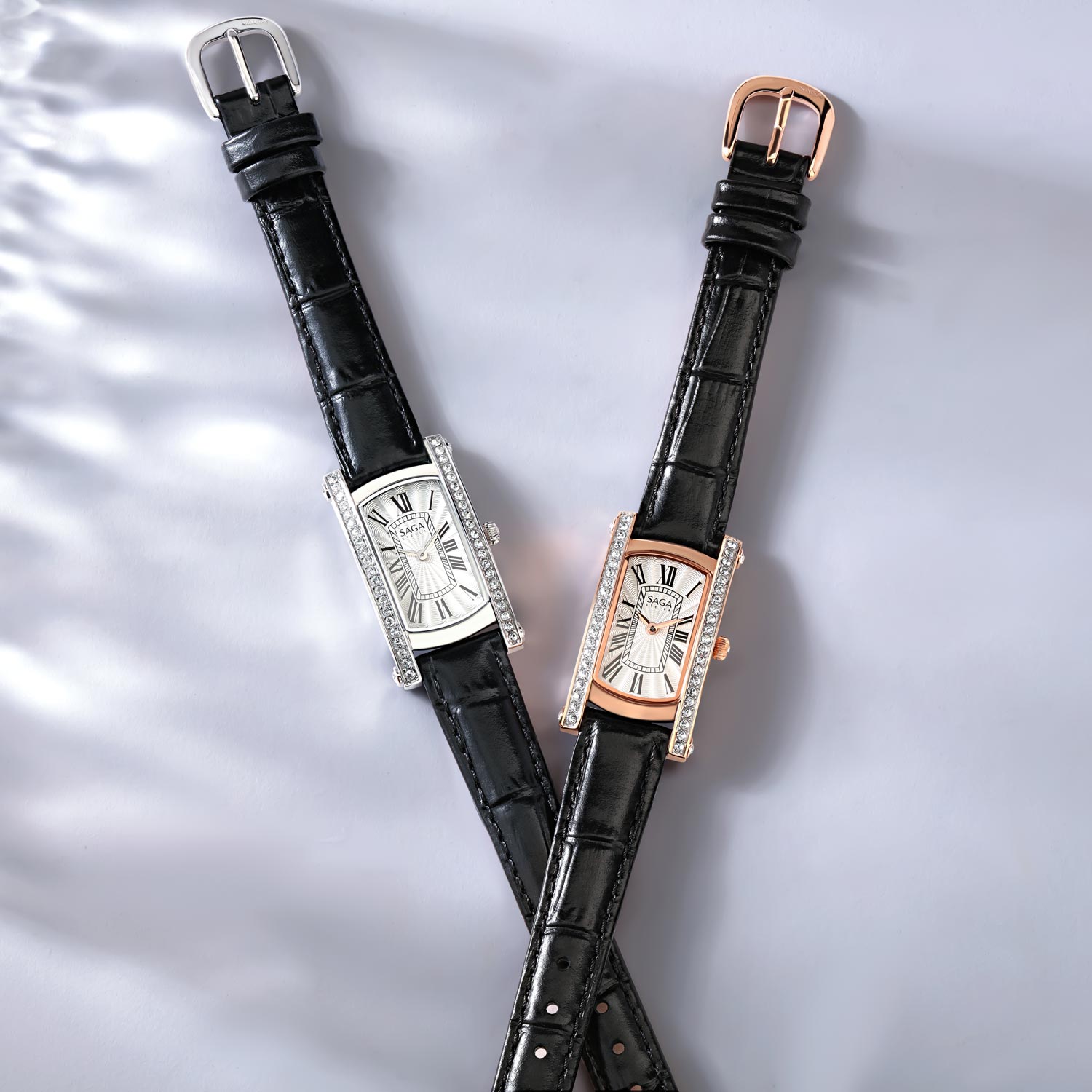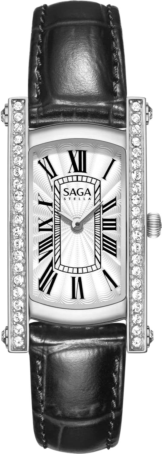 Сдержанный классический дизайн часов компенсируется утонченным блеском кристаллов. Идеальное сочетание элегантности и изящества. Наручные кварцевые часы. Стальной прямоугольный корпус, украшенный кристаллами. Гильошированный циферблат украшен логотипом Saga. Метки в виде римских цифр. Рифленая заводная головка. Кожаный ремешок с классической застежкой.