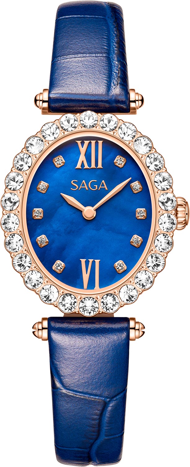 Прекрасное сочетание соблазнительной женственности и элегантности. Эти часы идеально дополнят ваш образ. Женственные наручные часы. Овальный стальной корпус с блистательным кольцом из кристаллов. Циферблат из натурального перламутра украшен логотипом Saga. Накладные метки в виде римских цифр и точек с кристаллами. Кожаный ремешок с классической застежкой.