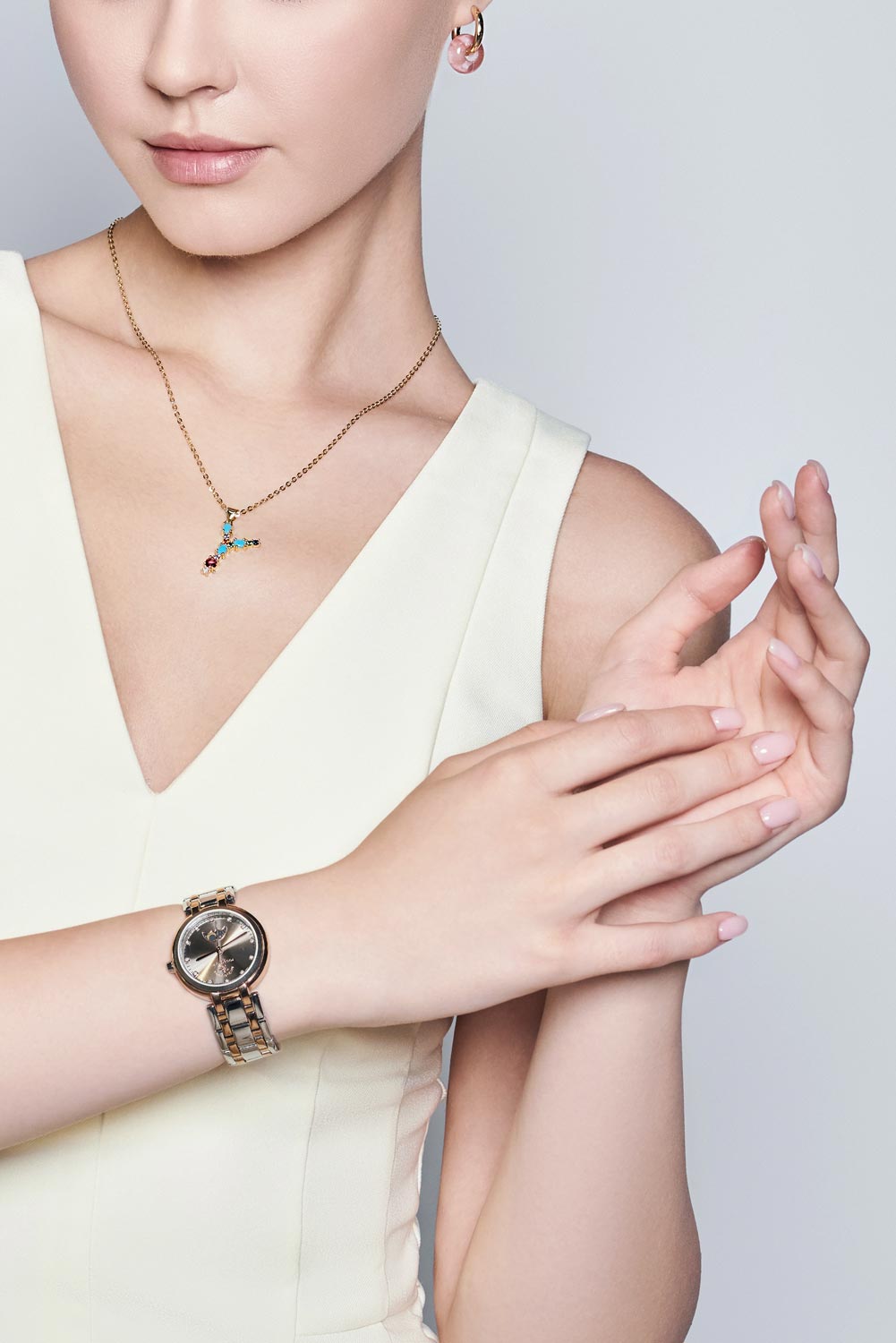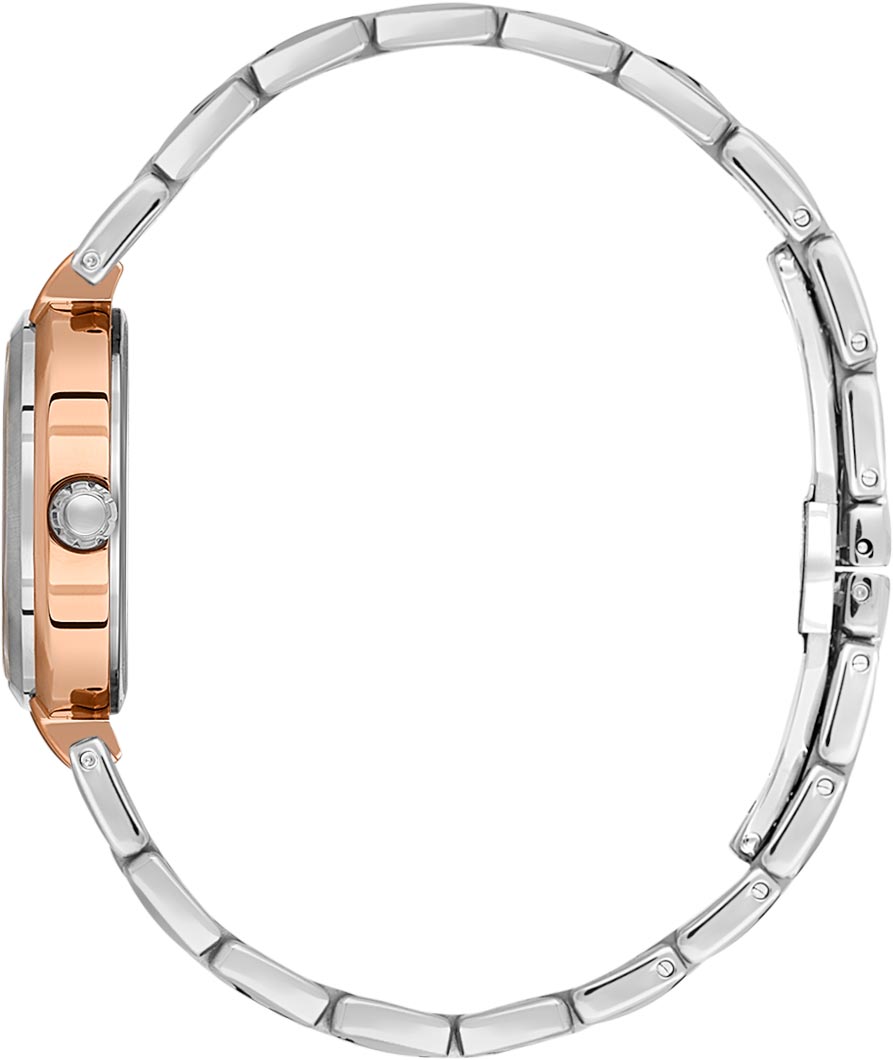 Непревзойденный, изысканный дизайн этих часов завораживающим очарованием украсит ваше запястье. Кварцевые наручные женские часы. Круглый стальной корпус с полированной отделкой. Циферблат выполнен по технологии Sunray (солнечные лучи) и украшен фирменным логотипом. Накладные метки в виде точек с кристаллами. Индикатор день/ночь. Конусная рифленая заводная головка. Надежный стальной браслет с раскладывающейся застежкой.