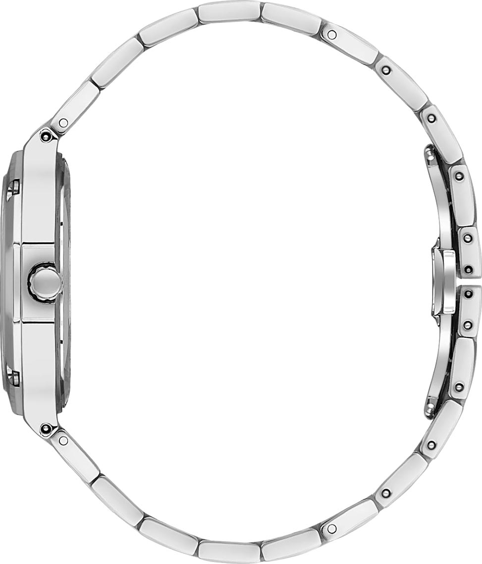 Заостренные прямоугольные стрелки в стиле Baton. Стрелки и метки с люминесцентным покрытием, которое светится в темноте после непродолжительной зарядки на свету. Рифленая заводная головка. Стальной браслет с раскладывающейся застежкой.