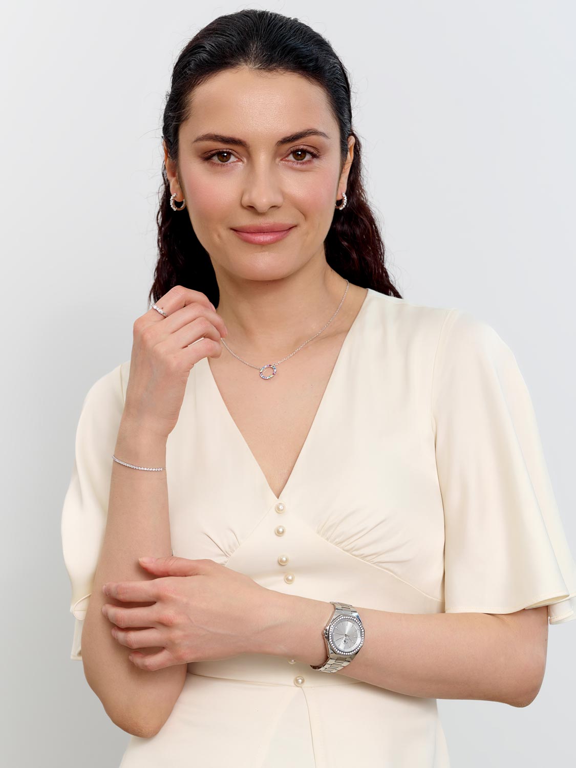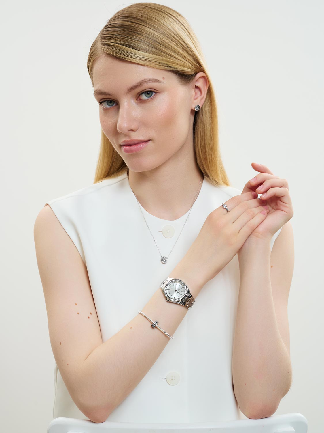 Unique. Женские часы с круглым стальным корпусом. Циферблат с метками в виде штрихов выполнен по технологии Sunray (солнечные лучи). Граненый безель украшен паве из кристаллов. Рифленая заводная головка с защитой. Надежный стальной браслет с раскладывающейся застежкой.